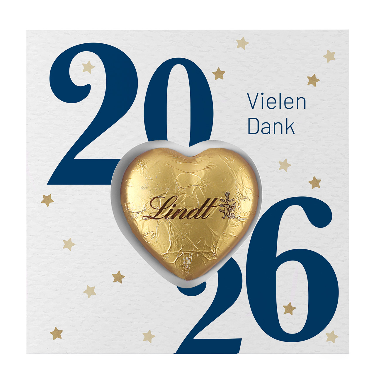 Material und Design: Die Neujahrskarte besticht durch ein schlichtes, aber modernes Design mit dem Jahr "2026" in großer, stilvoller Schrift auf der Vorderseite. Das Highlight bildet ein hochwertiges Lindt-Alpenvollmilch-Schokoladenherz, das in glänzender Goldfolie verpackt ist. Auf der Rückseite oder im Inneren kann Ihr individuelles Neujahrsgruß sowie Ihr Firmenlogo platziert werden.