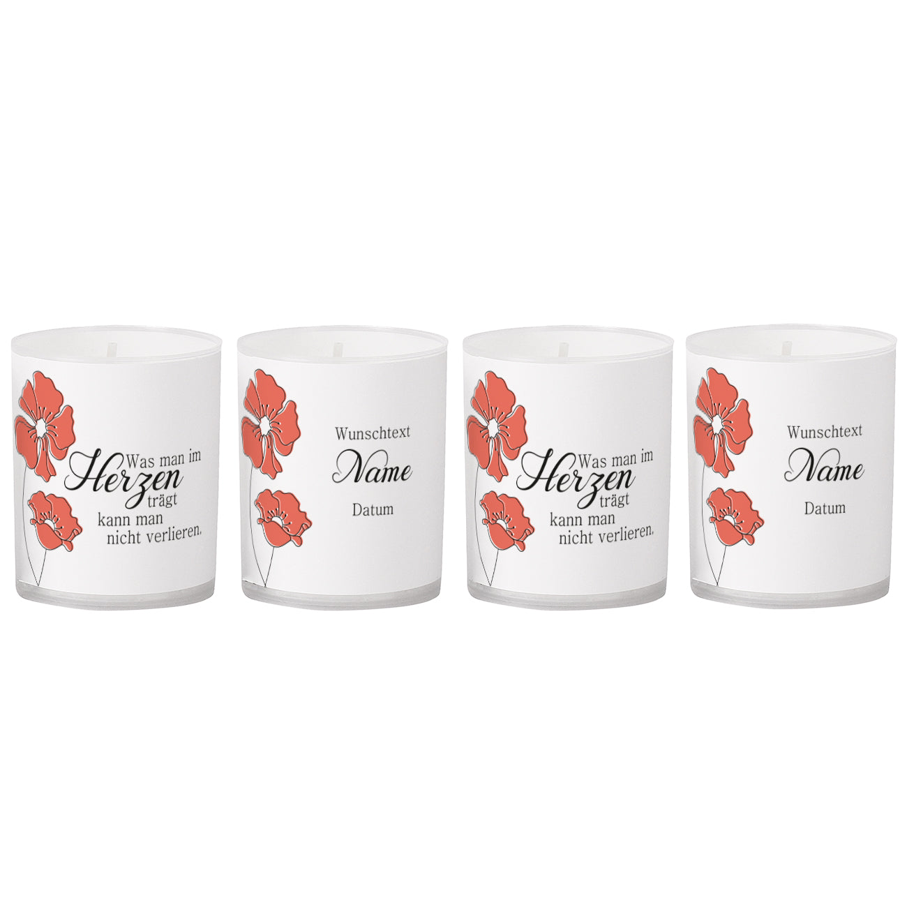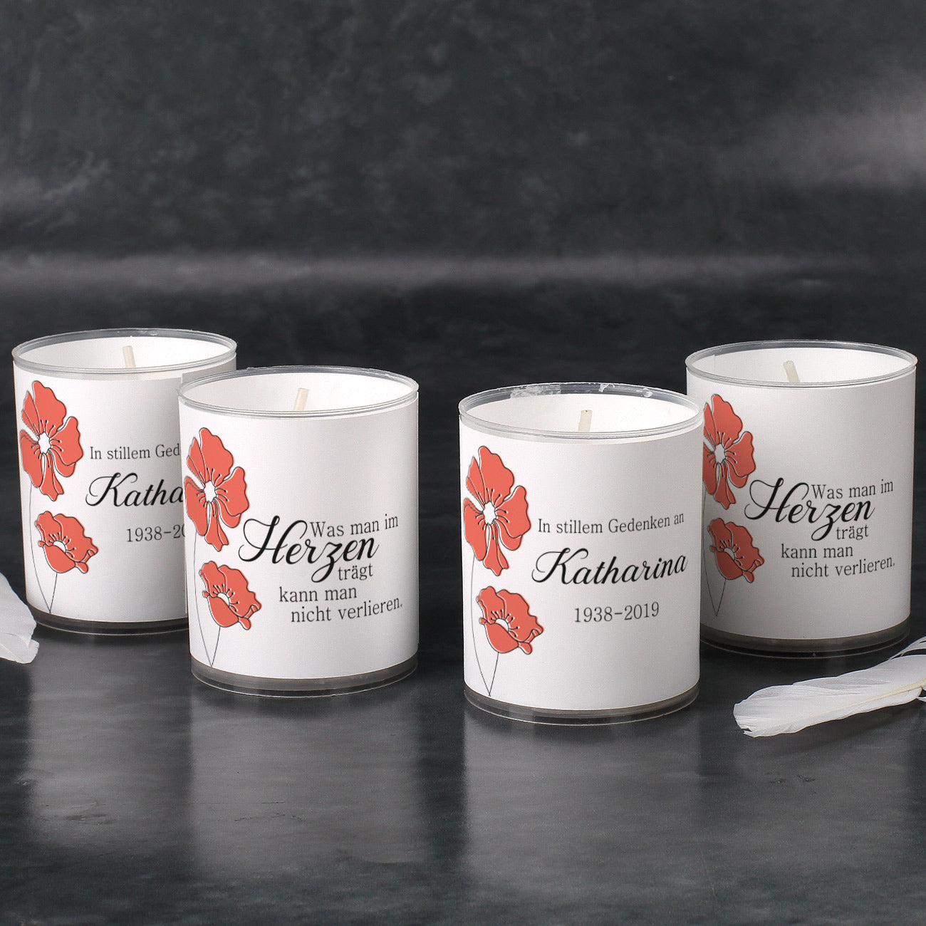 In diesem Set sind vier Kerzen enthalten. Die Echtwachskerzen befinden sich in einem Plastikbecher. Beklebt werden die Plastikbecher mit einer Banderole. Auf zwei Banderolen wird der Spruch "Was man im herzen trägt kann man nicht verlieren" gedruckt. Und auf den anderen zwei Banderolen wird der persönliche Wunschtext, der Name des Verstorbenen sowie das Datum platziert. Abgerundet wird das Ganze durch Klatschmohnen.