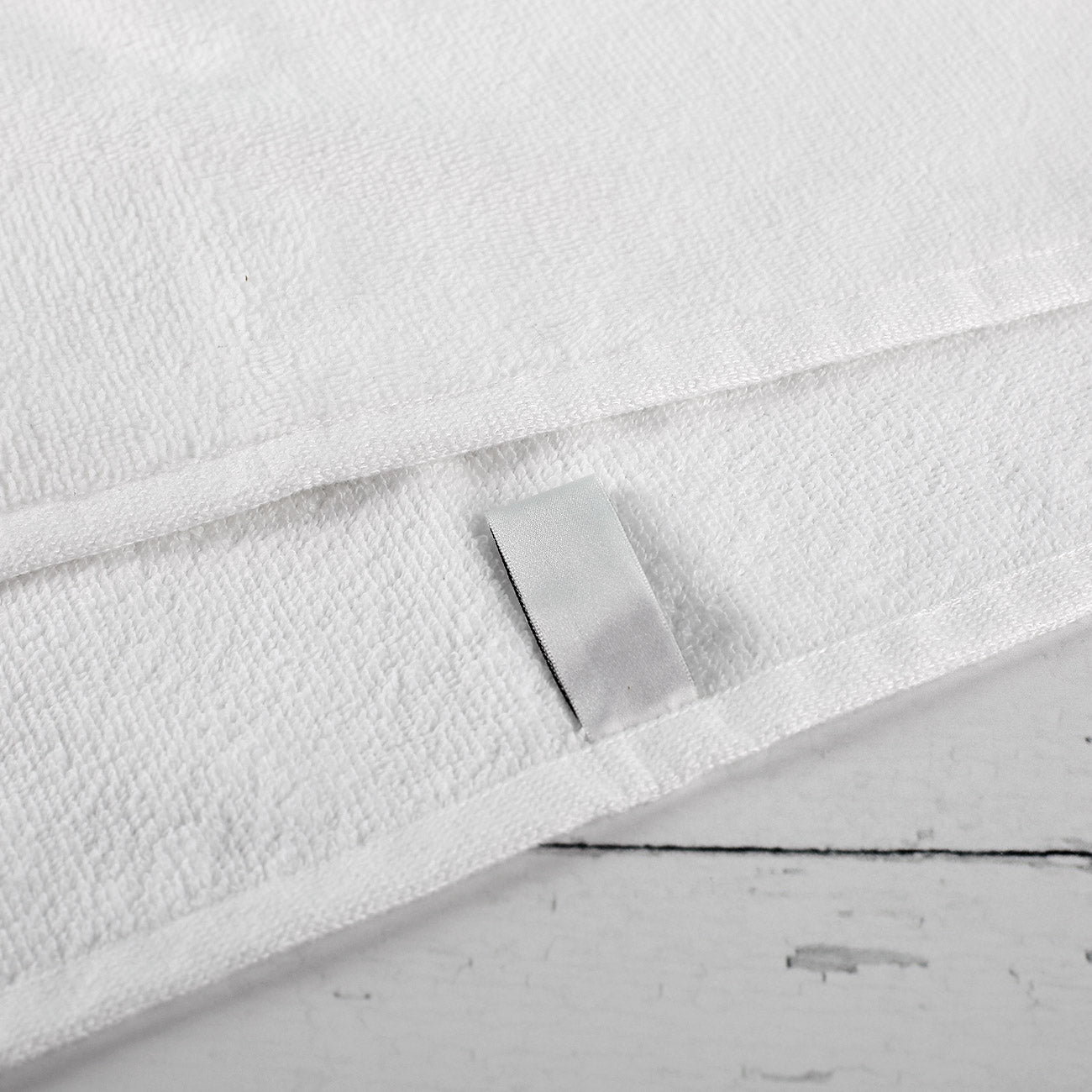Das weiße Handtuch besteht aus 60 % Baumwolle und 40 % Polyester und kann bei 40° gewaschen werden.