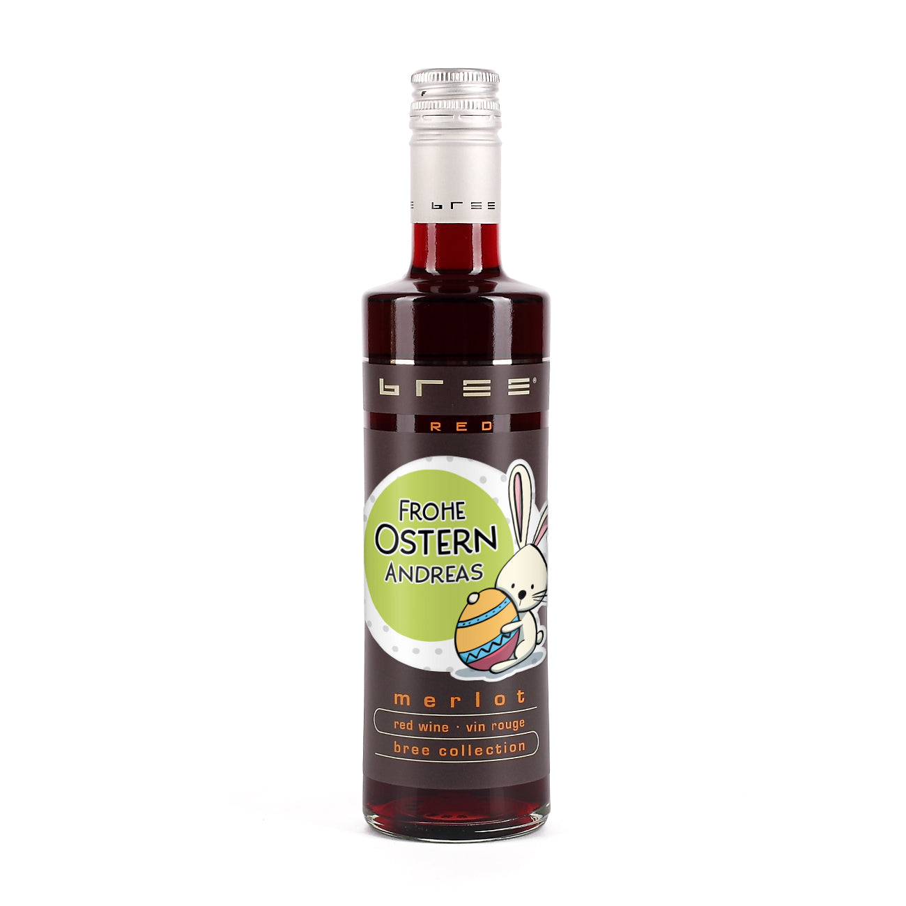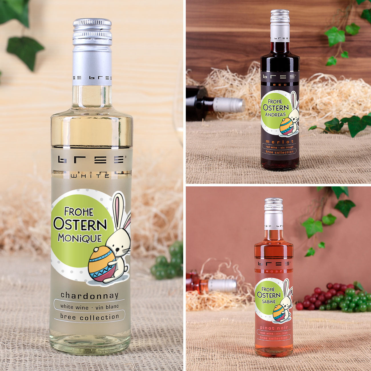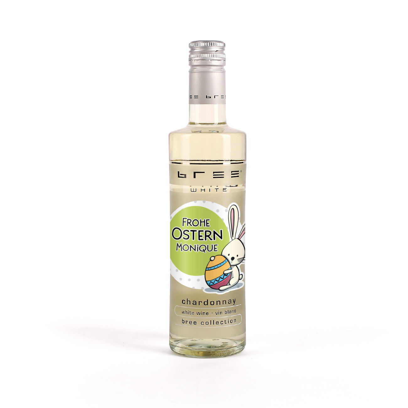 Mit diesem Wein von Bree haben Sie ein besonderes Ostergeschenk für Ihre Mitarbeiter parat. Diese Weinflasche wird mit süßen Ostergrüßen veredelt. Ein kleiner Osterhase mit einem bunt bemalten Osterei in der Hand. Zu den Ostergrüßen verziert der Name des Beschenkten das Etikett. Machen Sie Ihren Mitarbeitern eine kleine Freude zu Ostern. Die Weinflasche hat einen Inhalt von 250 ml. Sie können zwischen drei verschiedenen Weinsorten wählen:
