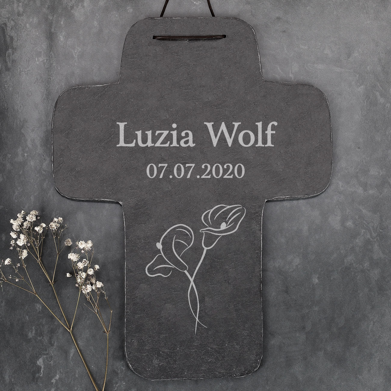 Gedenkkreuz mit Name und Datum – Calla Blume