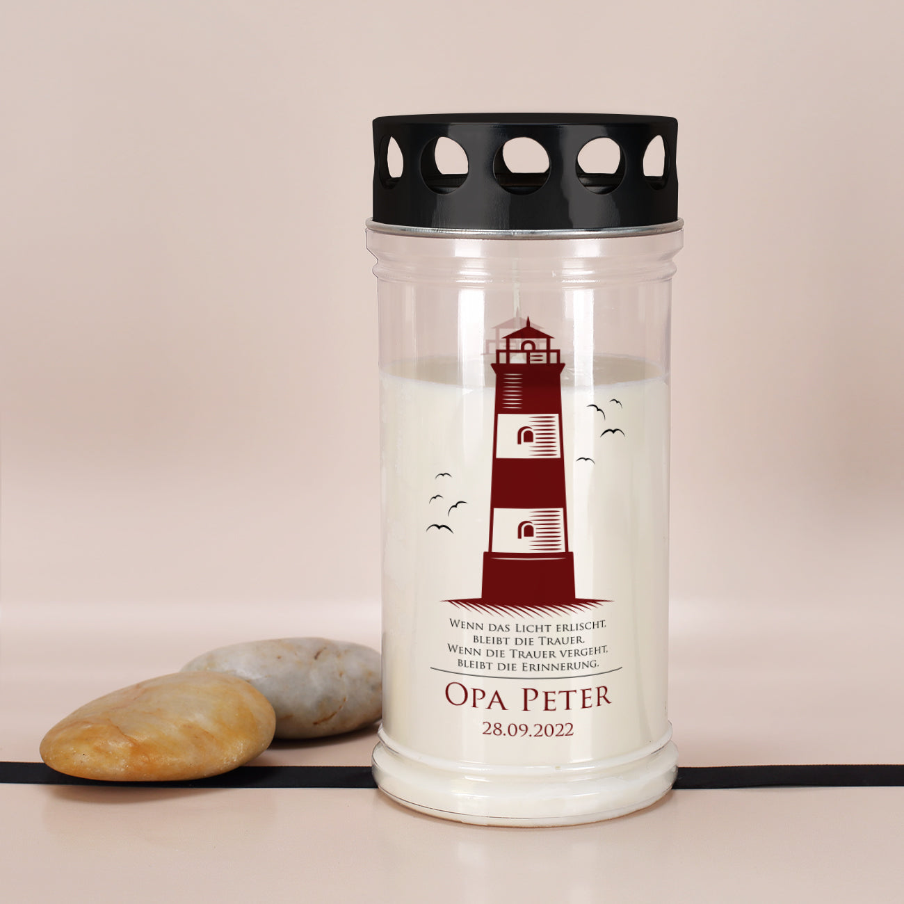 Mit dem Motiv des Leuchtturms eignet sich das Trauerlicht besonders gut für Menschen, die zu Ihren Lebzeiten eng mit der See und dem Meer verbunden waren. Hinzu kommt der gedruckte Spruch: "Wenn das Licht erlischt, bleibt die Trauer. Wenn die Trauer vergeht, bleibt die Erinnerung." Vervollständigt wird das elegante Grablicht mit Vögeln die Ihre Bahnen am Horizont ziehen und somit ein geschlossenes Bild kreieren. Um das Gesamtpaket abzurunden, werden sowohl der Name als auch das Datum des Verstorbenen mit abgedruckt.