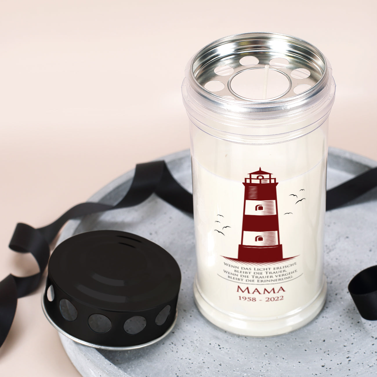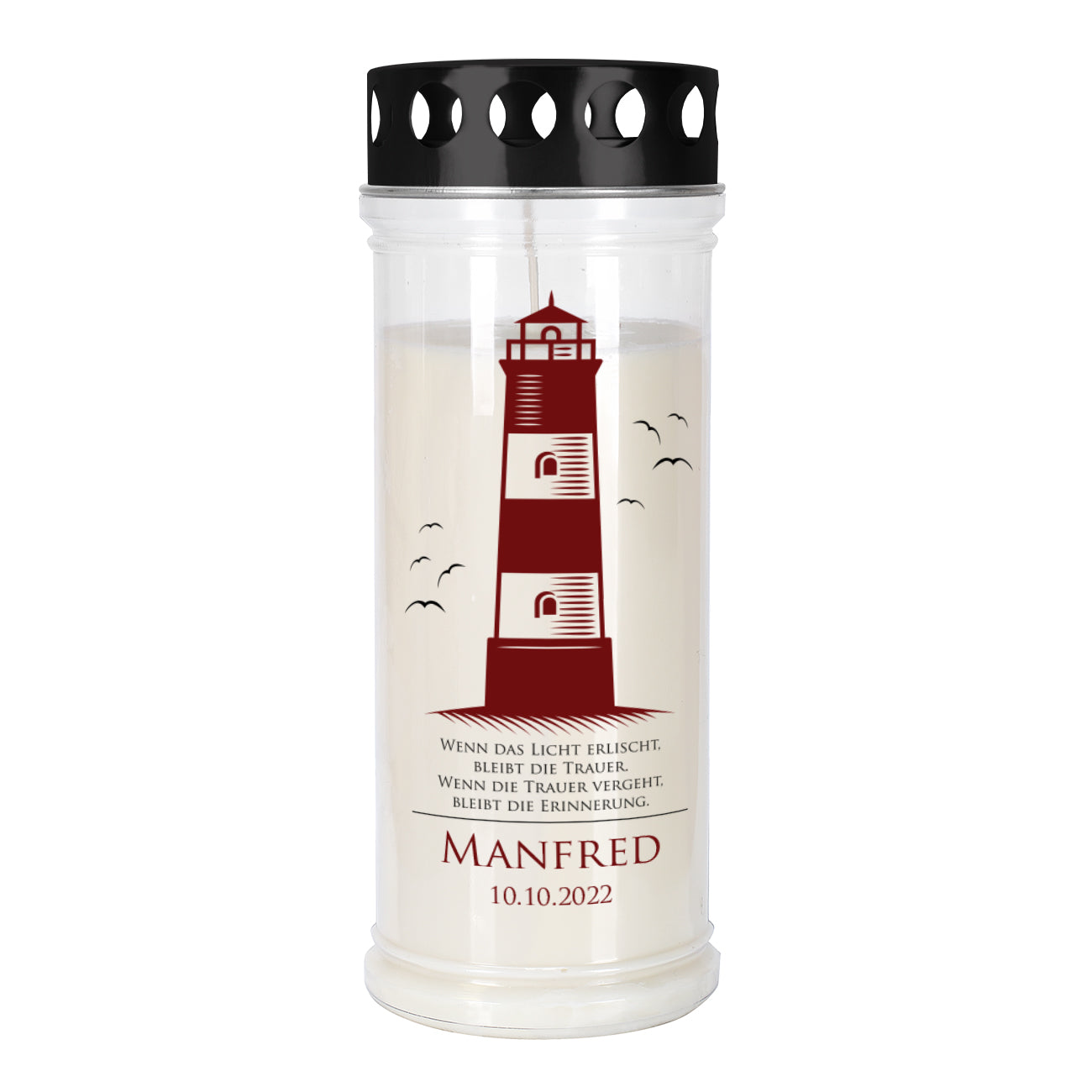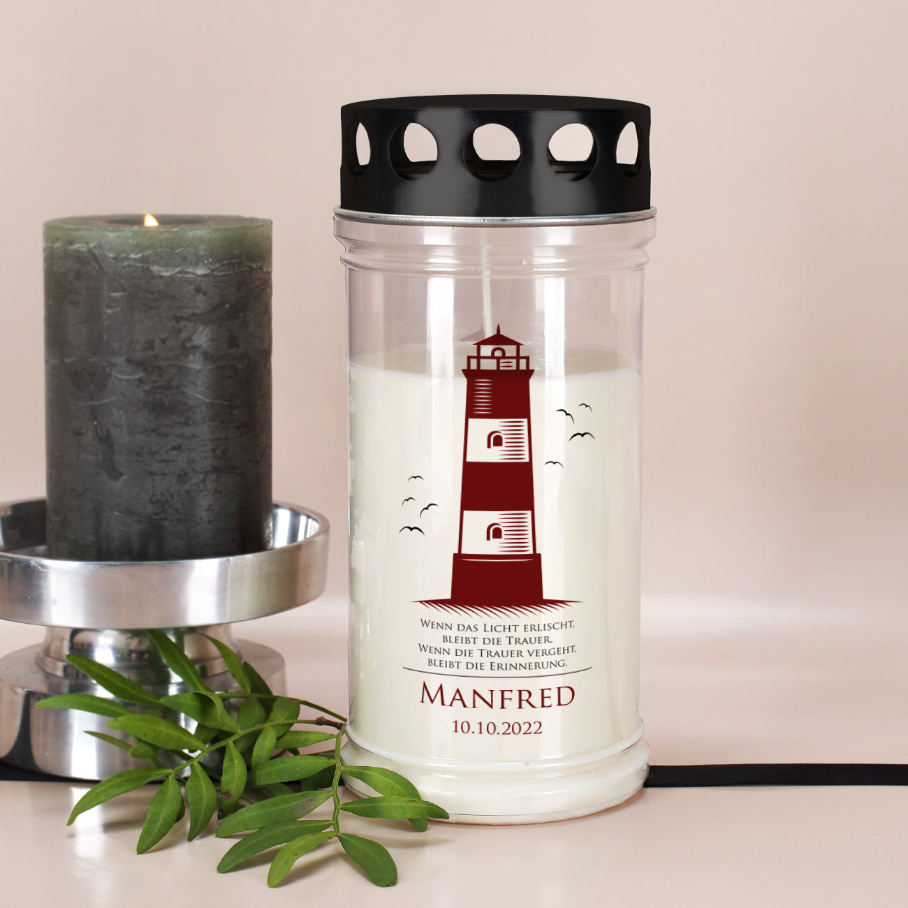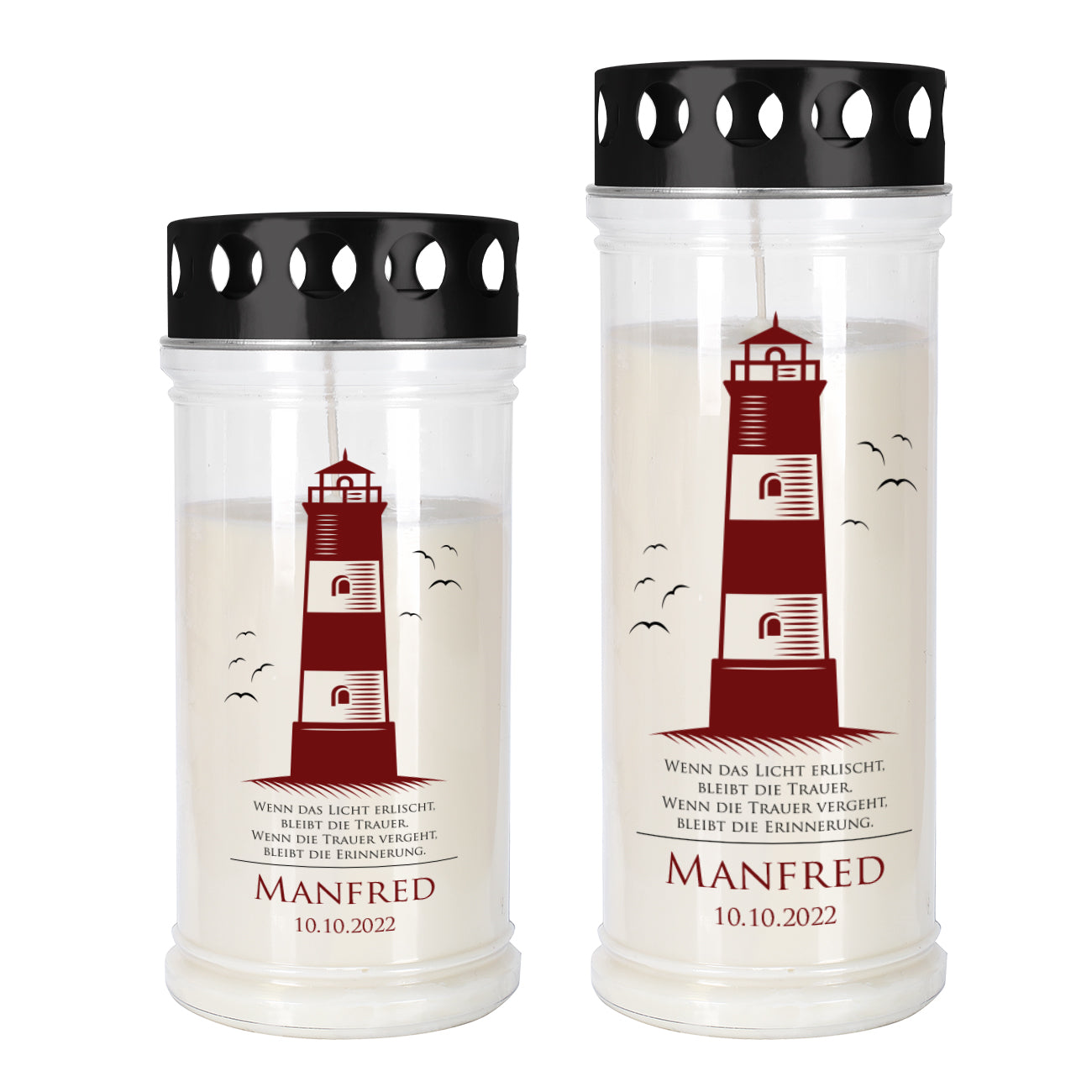Grablicht mit Leuchtturm-Motiv in zwei Größen mit Name und Datum