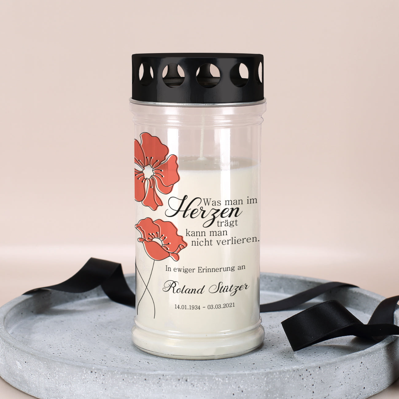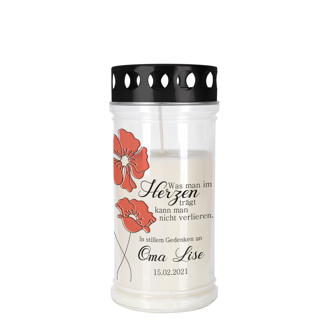 Das Grablicht wird mit zwei Mohnblumen bedruckt und zusätzlich verziert der Spruch "Was man im Herzen trägt kann man nicht verlieren." die Vorderseite. Abgerundet wird das Design mit Ihren Personalisierungen, die aus einem persönlichen Wunschtex, Name und Datum bestehen. So wird jedes Grablicht zu einem einzigartigen Stück was nur für Sie angefertigt wird.