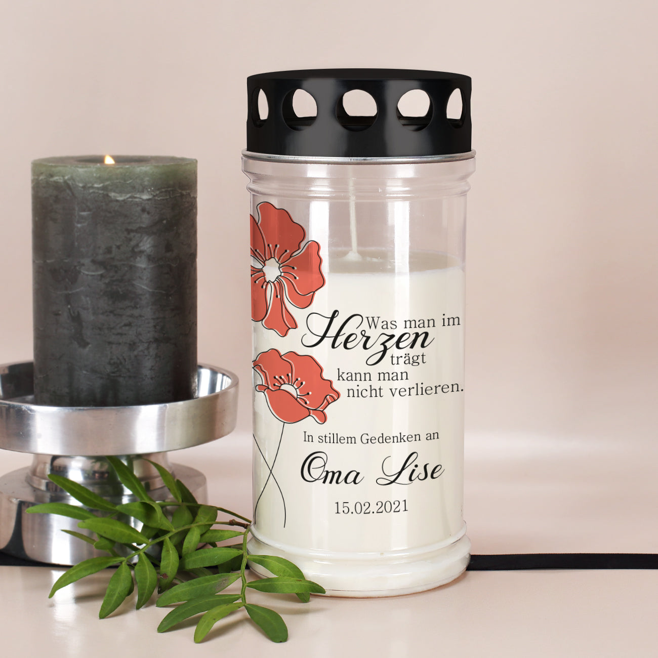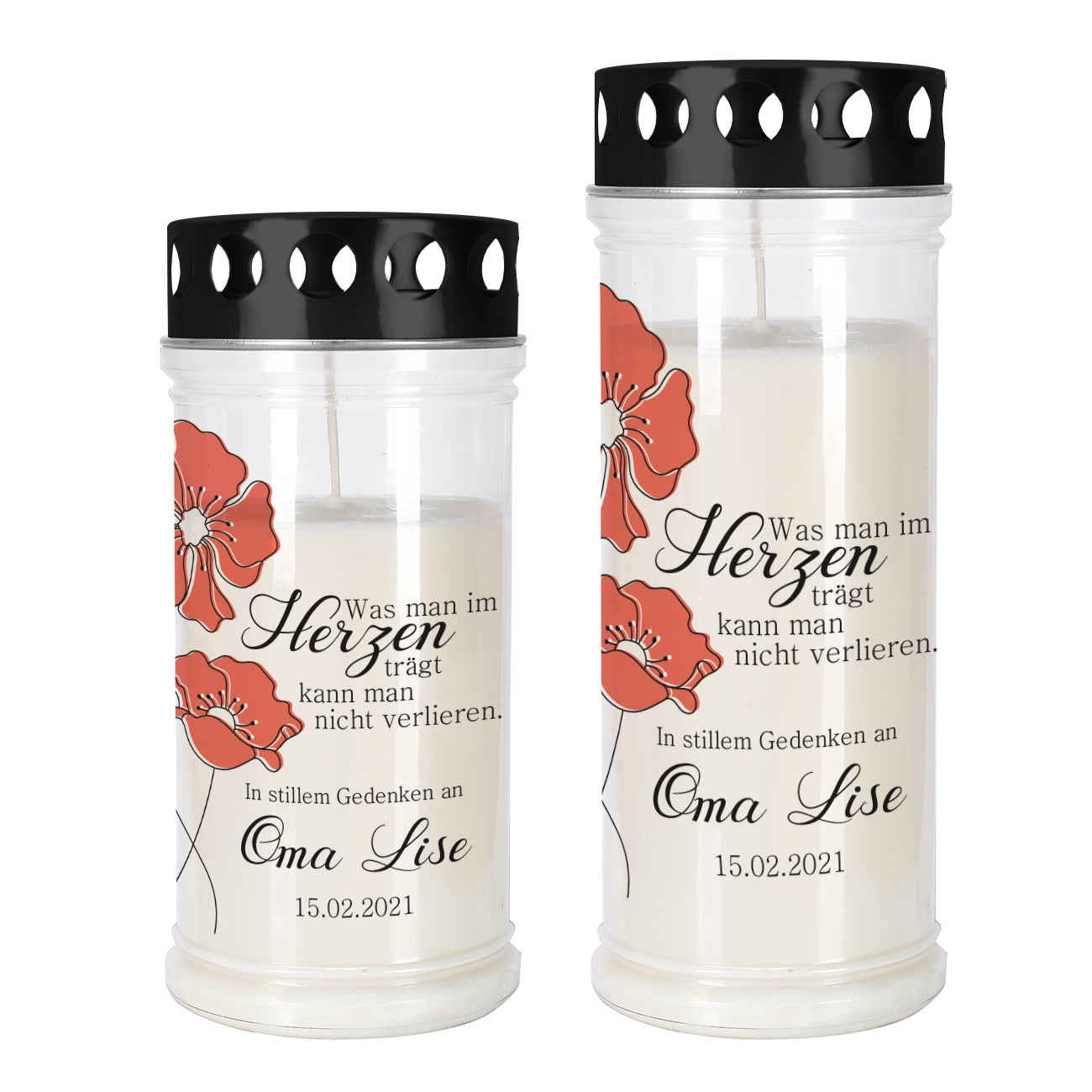 Grablicht mit Mohnblumen in zwei Größen mit Name und Datum
