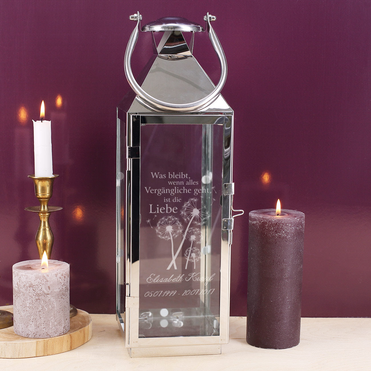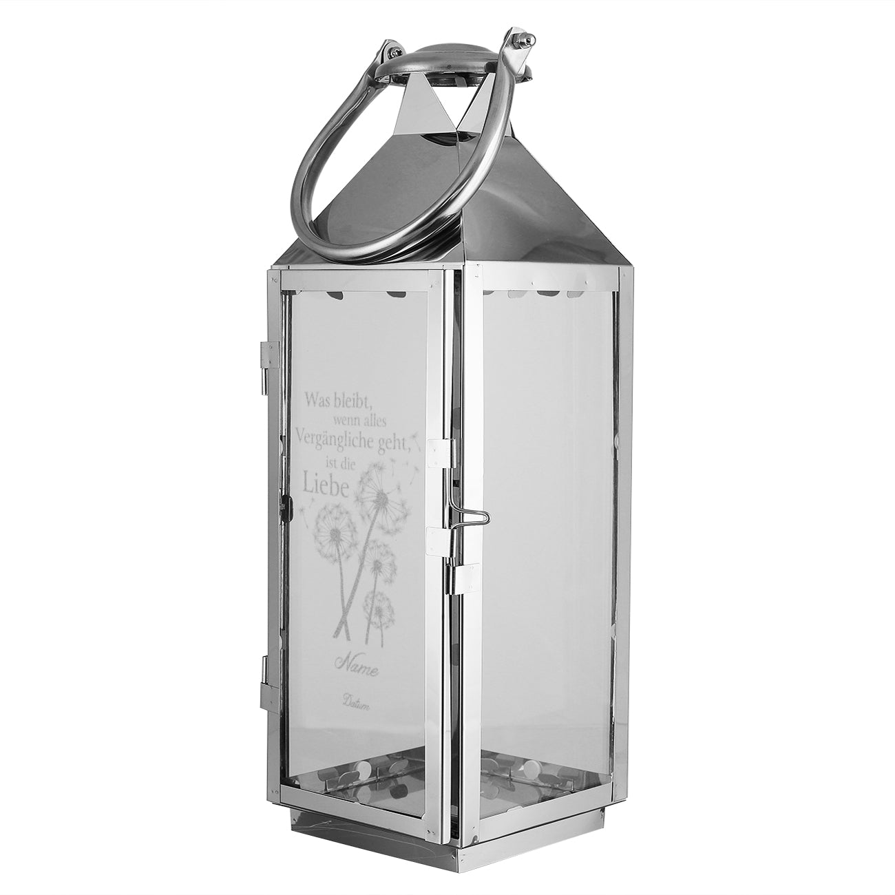 Auf dieser silberne Laterne wird einseitig der Spruch "Was bleibt, wenn alles Vergängliche geht, ist die Liebe" graviert. Verziert wird der Spruch von Pusteblumen und Pollen. Darunter wird der Name des oder der Verstorbenen sowie die Daten graviert.
