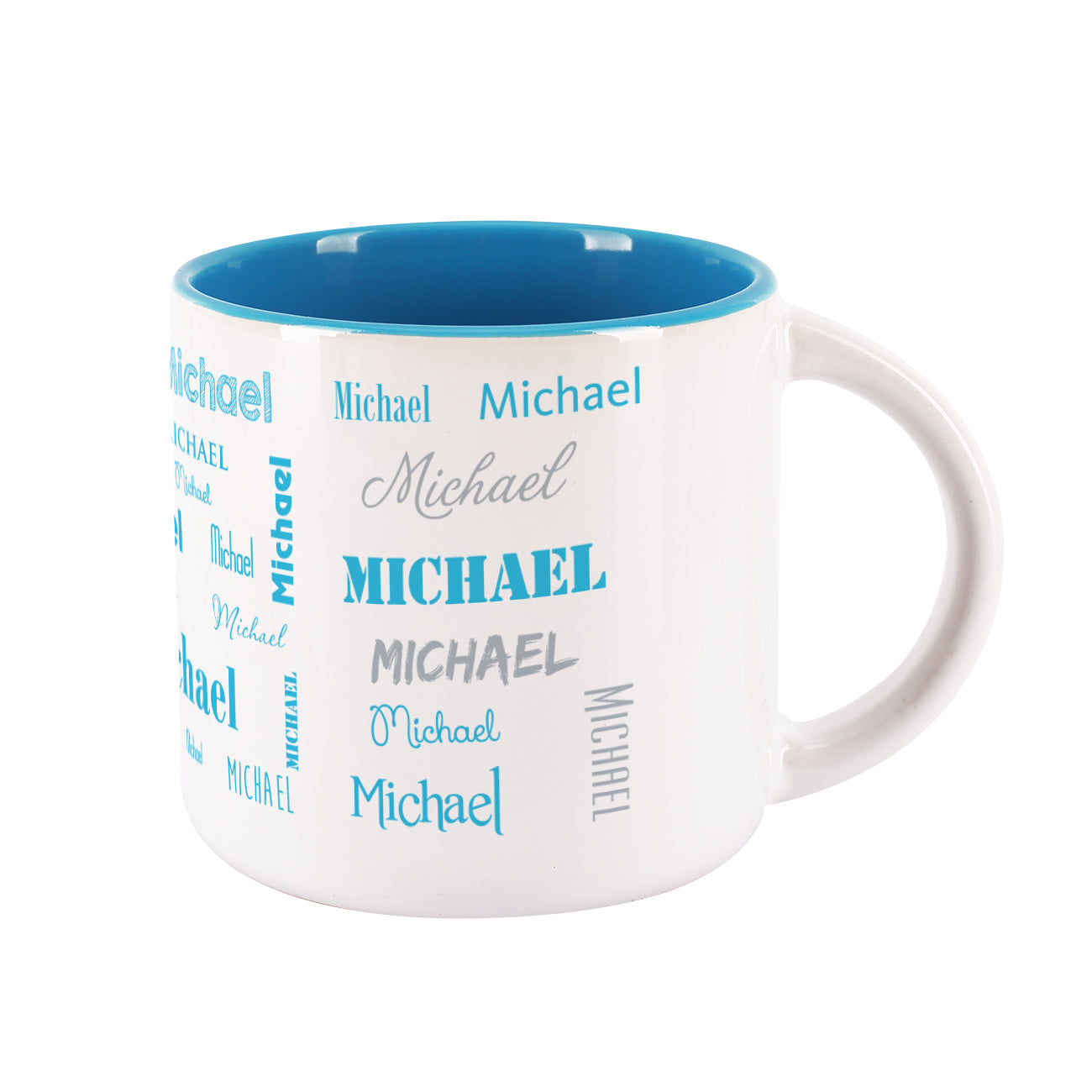 Großer Kaffeepott mit Name in verschiedenen Schriftarten bedruckt
