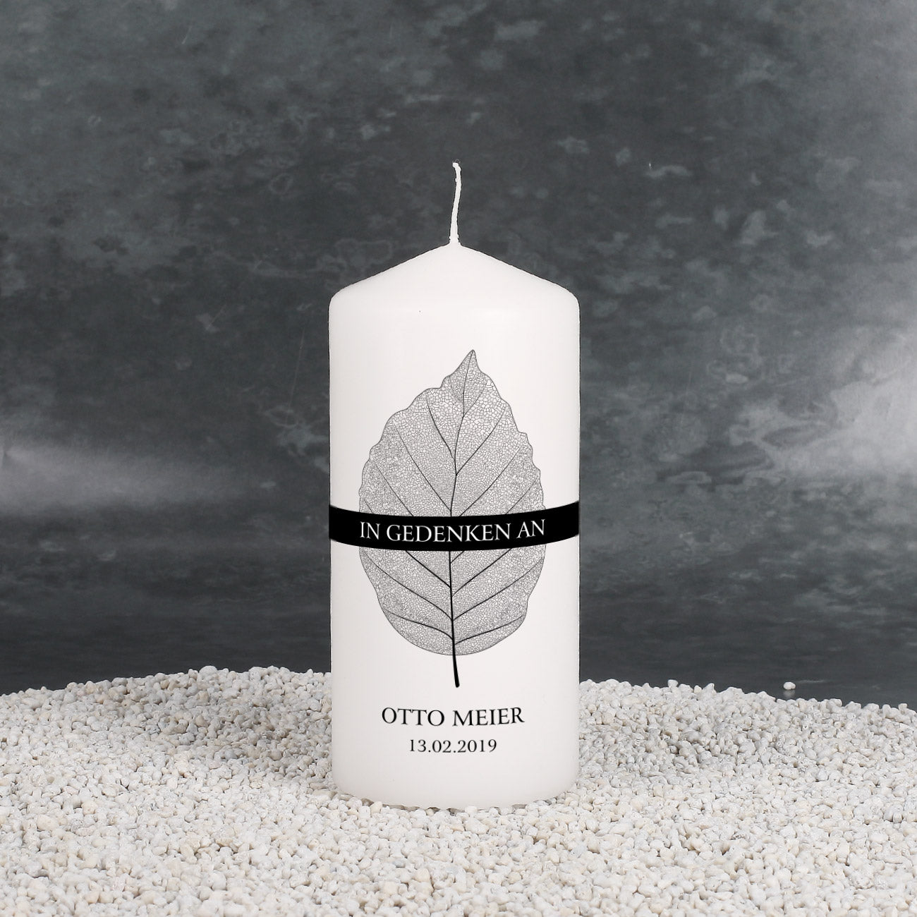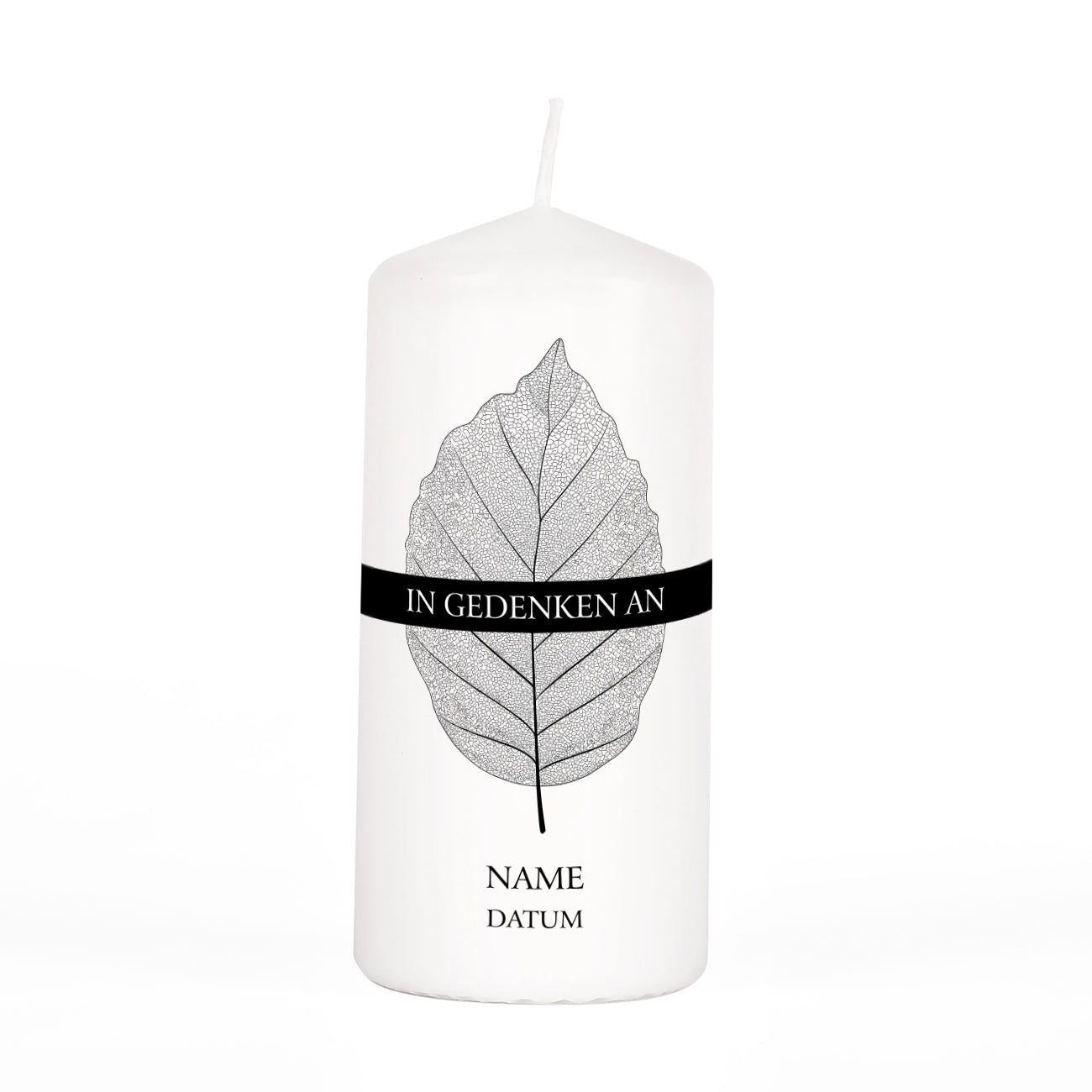 Bedruckt wird die Kerze mit einem großen Blatt. Darüber befindet sich der Schriftzug "In Gedenken an". Unter dem Blatt wird der Name des/der Verstorbenen sowie das Datum platziert.