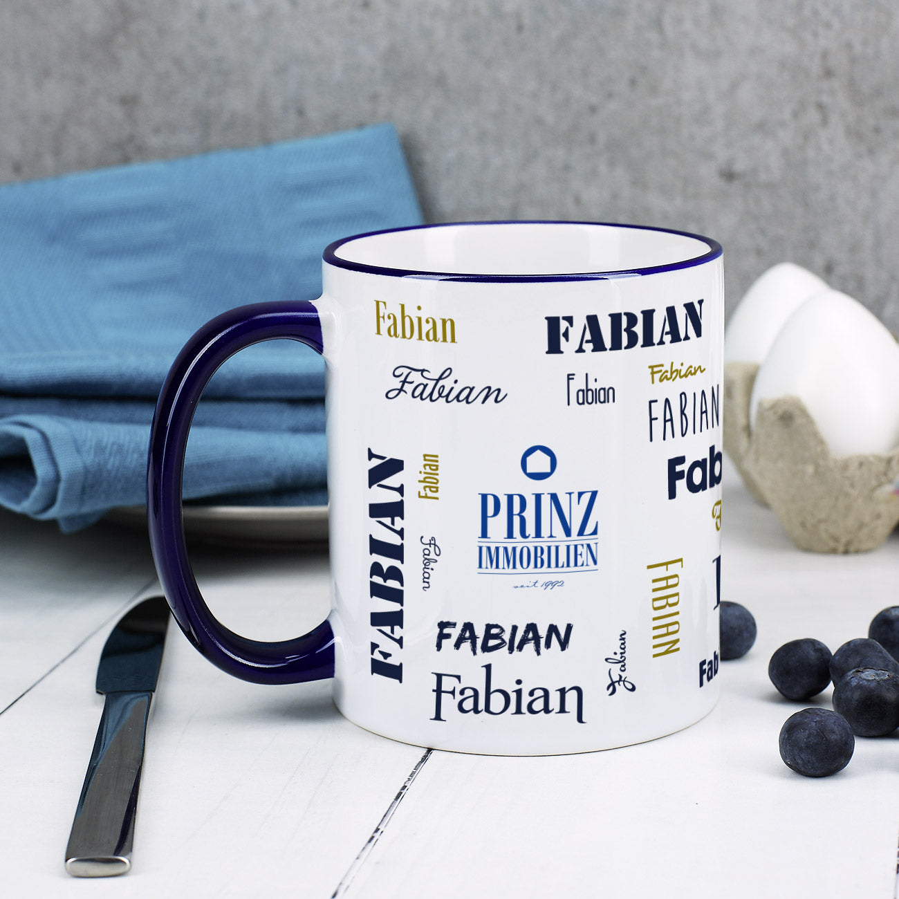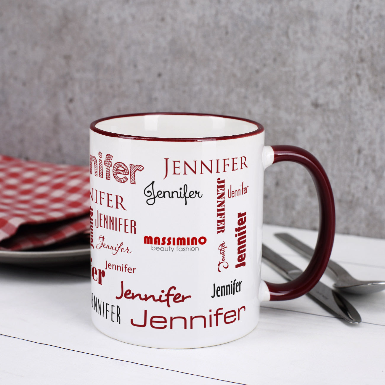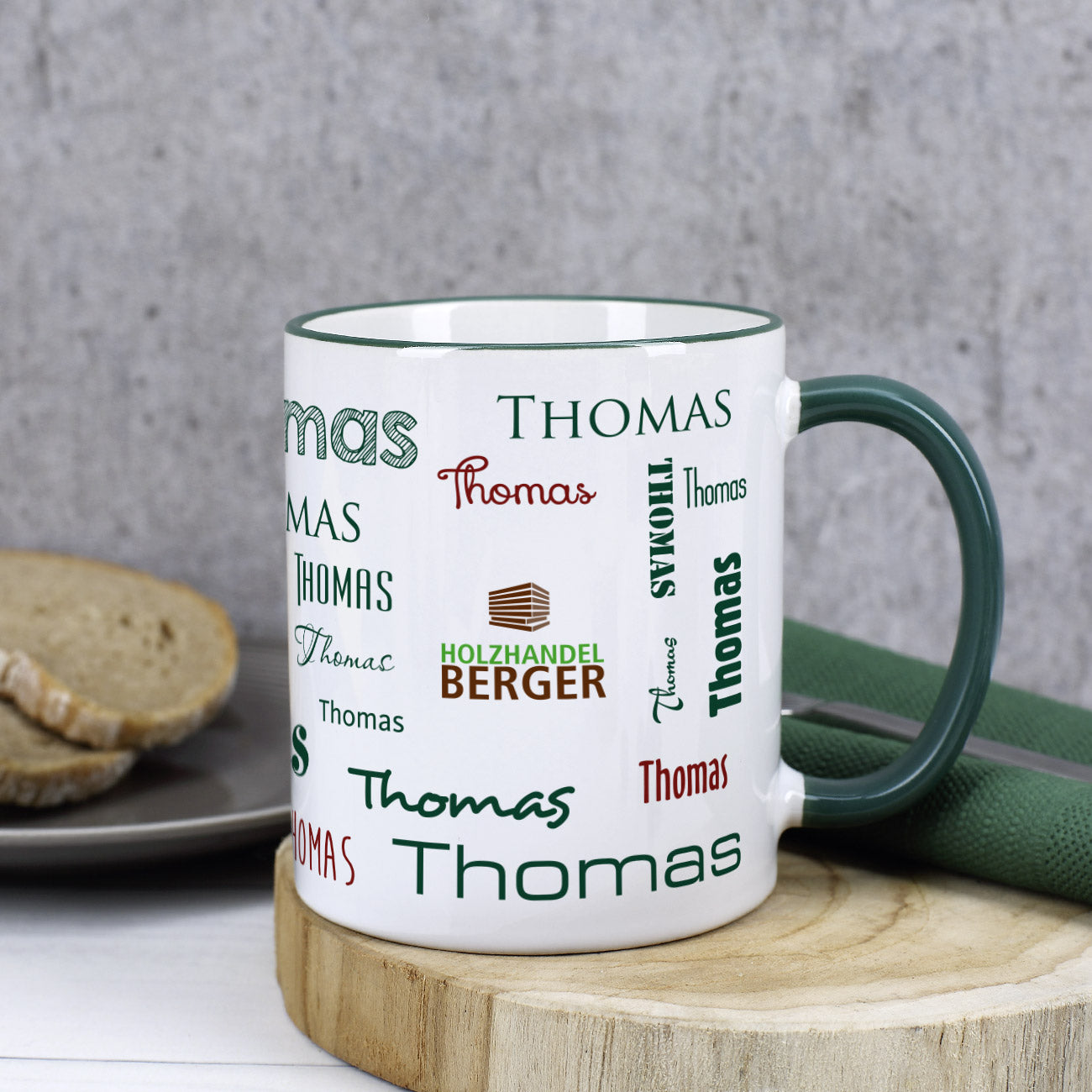 Egal ob mit Kaffee oder Tee gefüllt, jeder Mitarbeiter hat eine Tasse auf dem Schreibtisch stehen. Also warum nicht jeden Mitarbeiter seine eigene persönliche Tasse schenken. Dieser Keramikbecher wird umlaufen mit dem Namen des Mitarbeiters in verschiedenen Schriftarten bedruckt. Zwischendrin wird das Firmenlogo platziert.