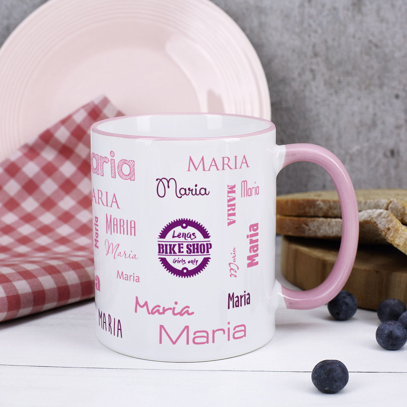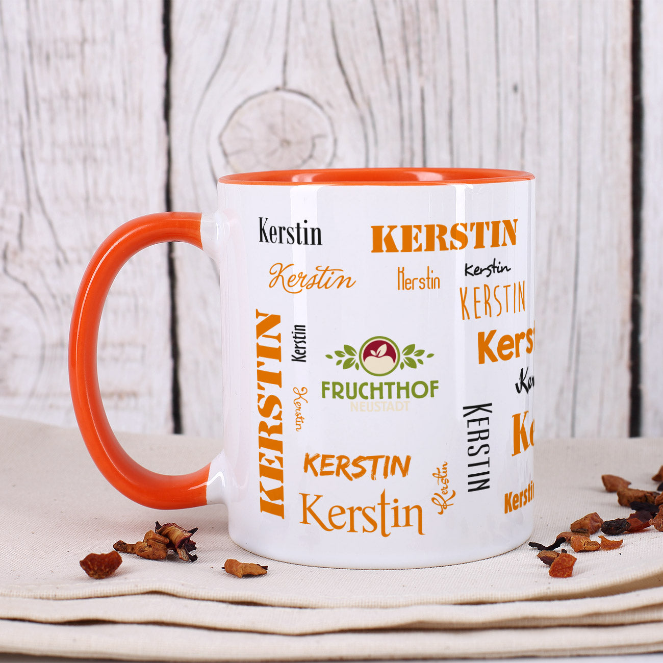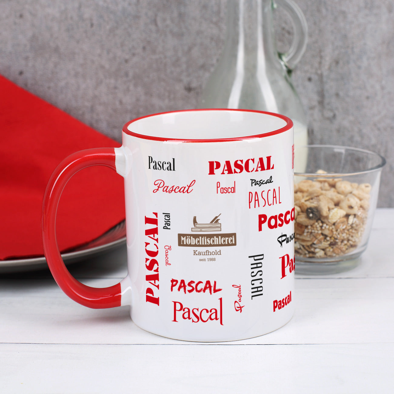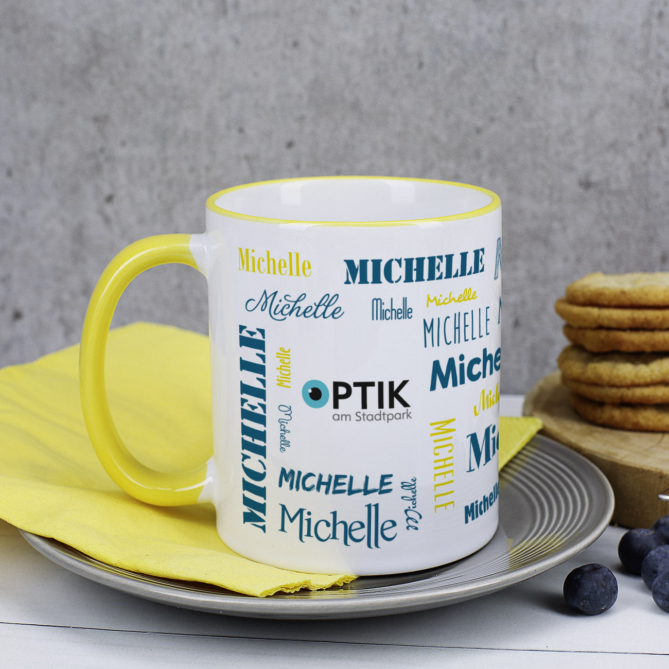 Egal ob mit Kaffee oder Tee gefüllt, jeder Mitarbeiter hat eine Tasse auf dem Schreibtisch stehen. Also warum nicht jeden Mitarbeiter seine eigene persönliche Tasse schenken. Dieser Keramikbecher wird umlaufen mit dem Namen des Mitarbeiters in verschiedenen Schriftarten bedruckt. Zwischendrin wird das Firmenlogo platziert.