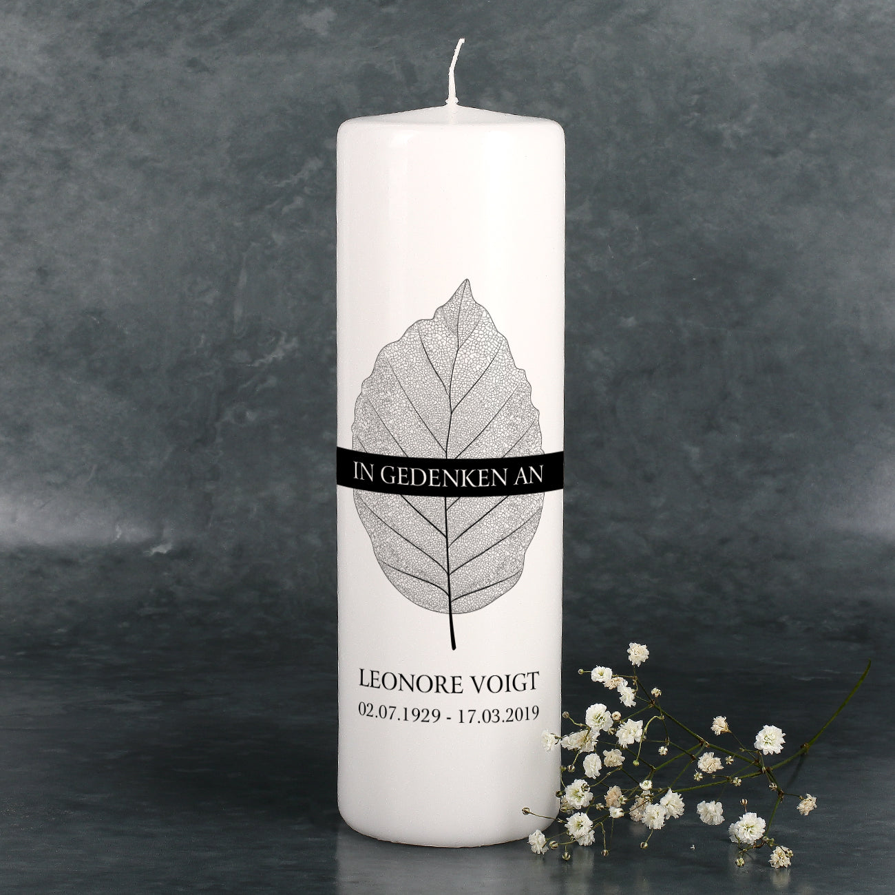 Personalisierte Trauerkerze mit Name und Lebensdaten "Blatt"
