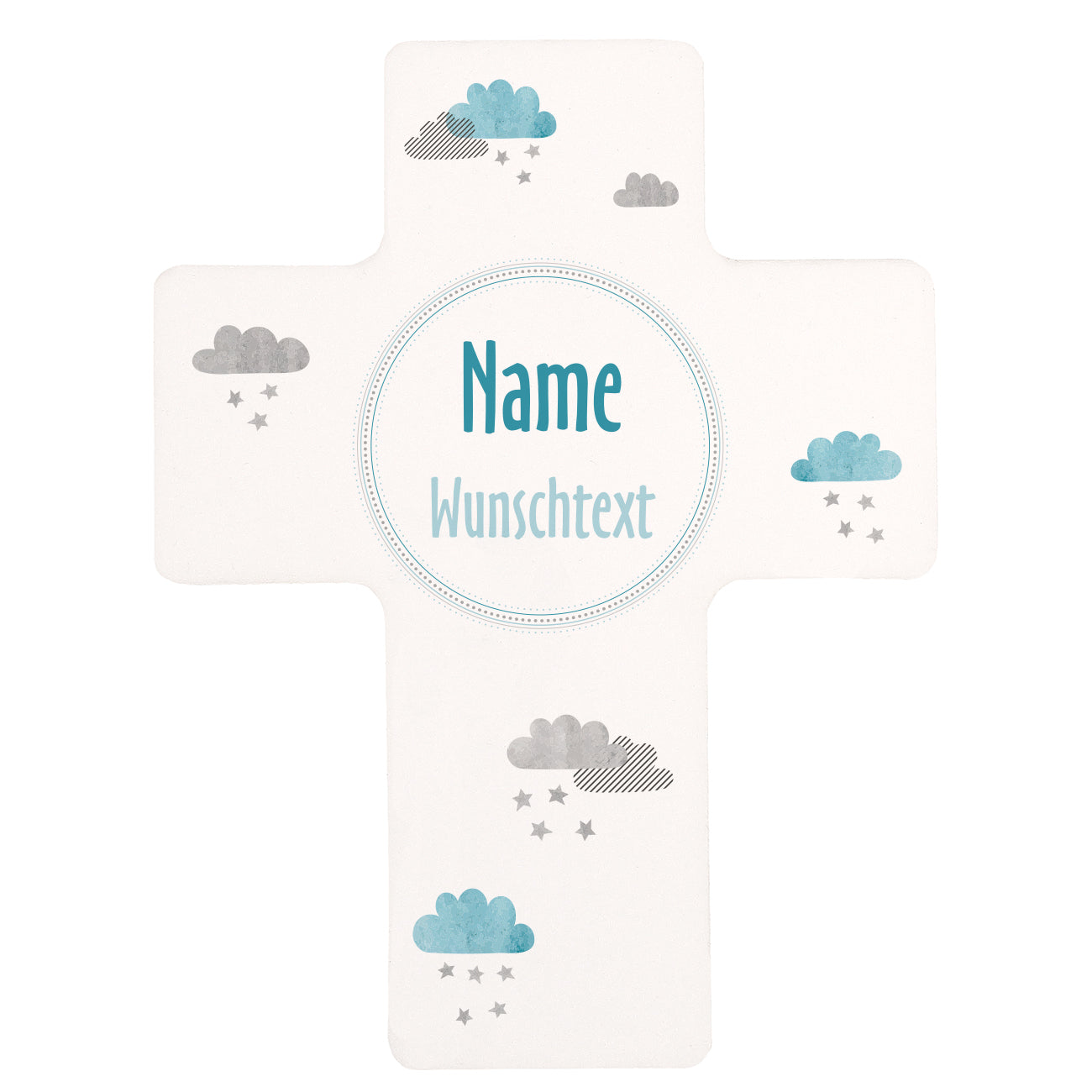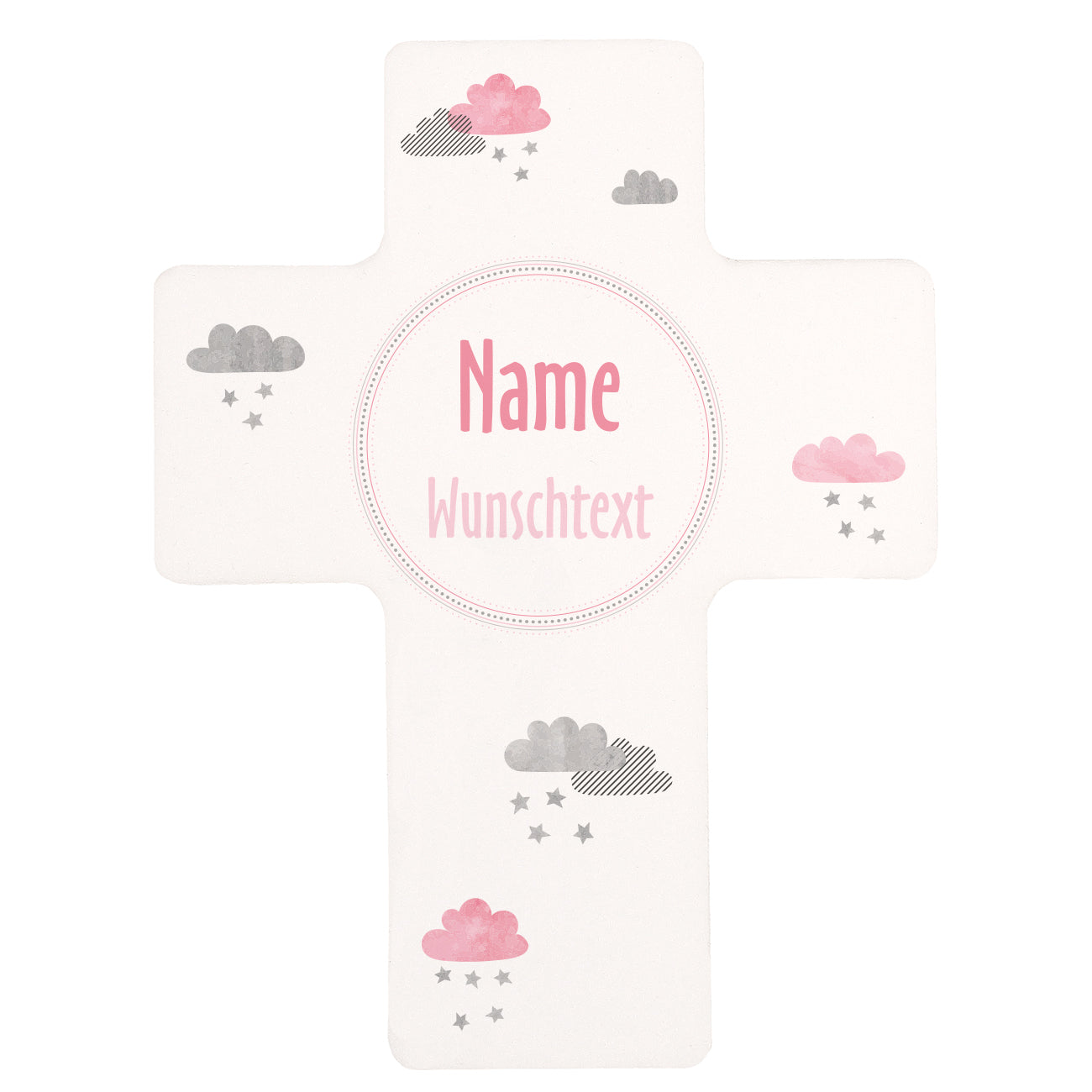 Dieses Gedenkkreuz für Sternenkinder ist aus Kunststoff und hat eine Größe von ca. 13,2 cm x 17,5 cm. Bedruckt wird das Kreuz mit dem Namen des Kindes sowie ein Wunschtext. Um dem Namen herum sind kleine Wolken mit Sternenregen zu sehen.