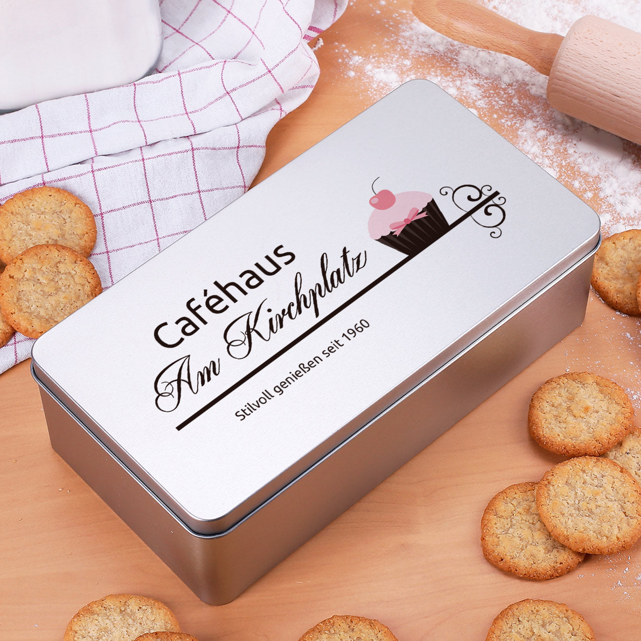 Diese rechteckige Metalldose eignet sich nicht nur super zur Aufbewahrung von Keksen, Süßigkeiten und Tee, sondern kann auch als Geschenkverpackung genommen werden. Die Dose hat eine Größe von 26 cm x 13,5 cm x 7,5 cm und hat einen abnehmbaren Deckel. Auf dem Deckel wird mit hochwertiger Technik Ihr Firmenlogo gedruckt.