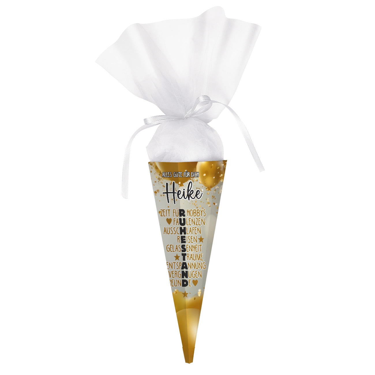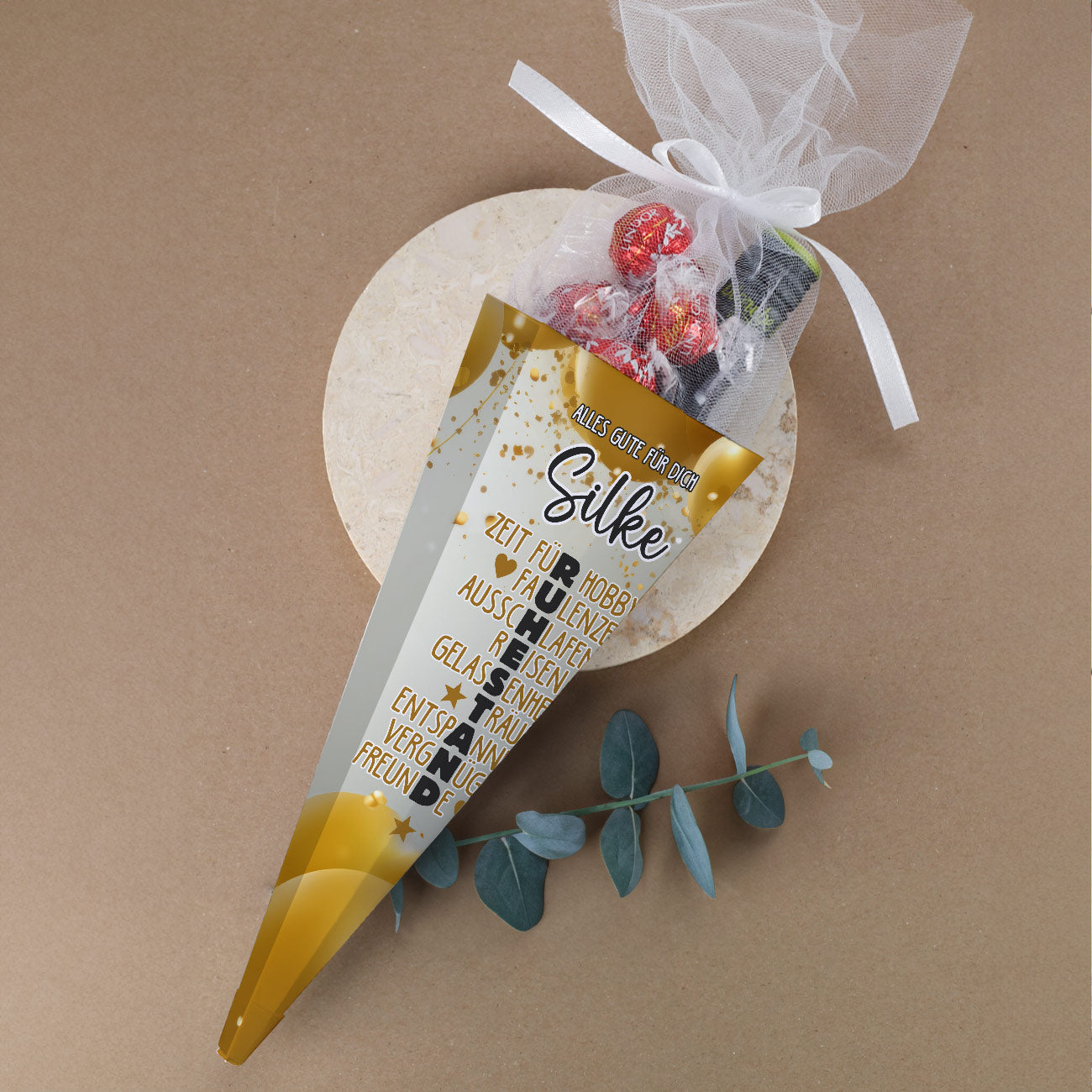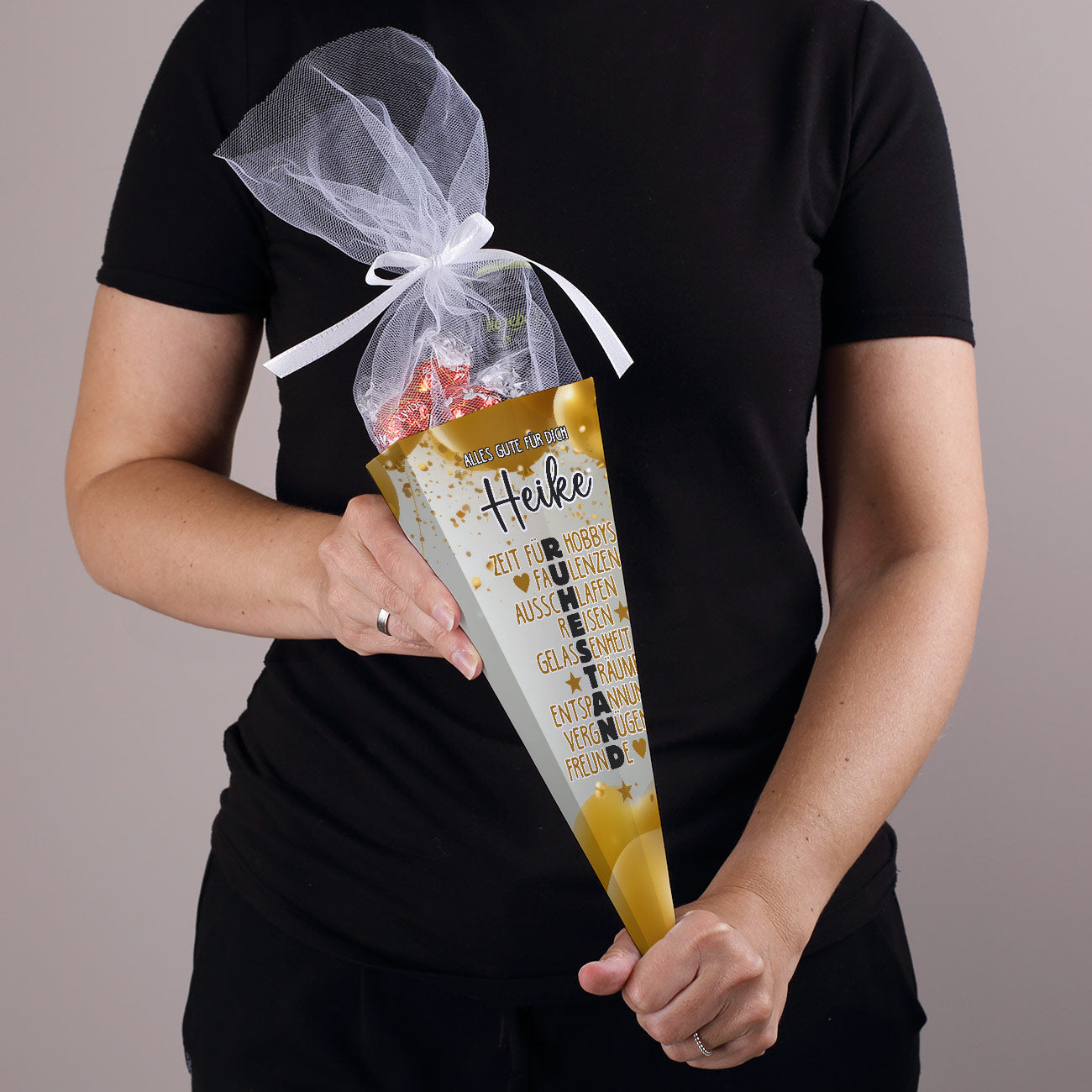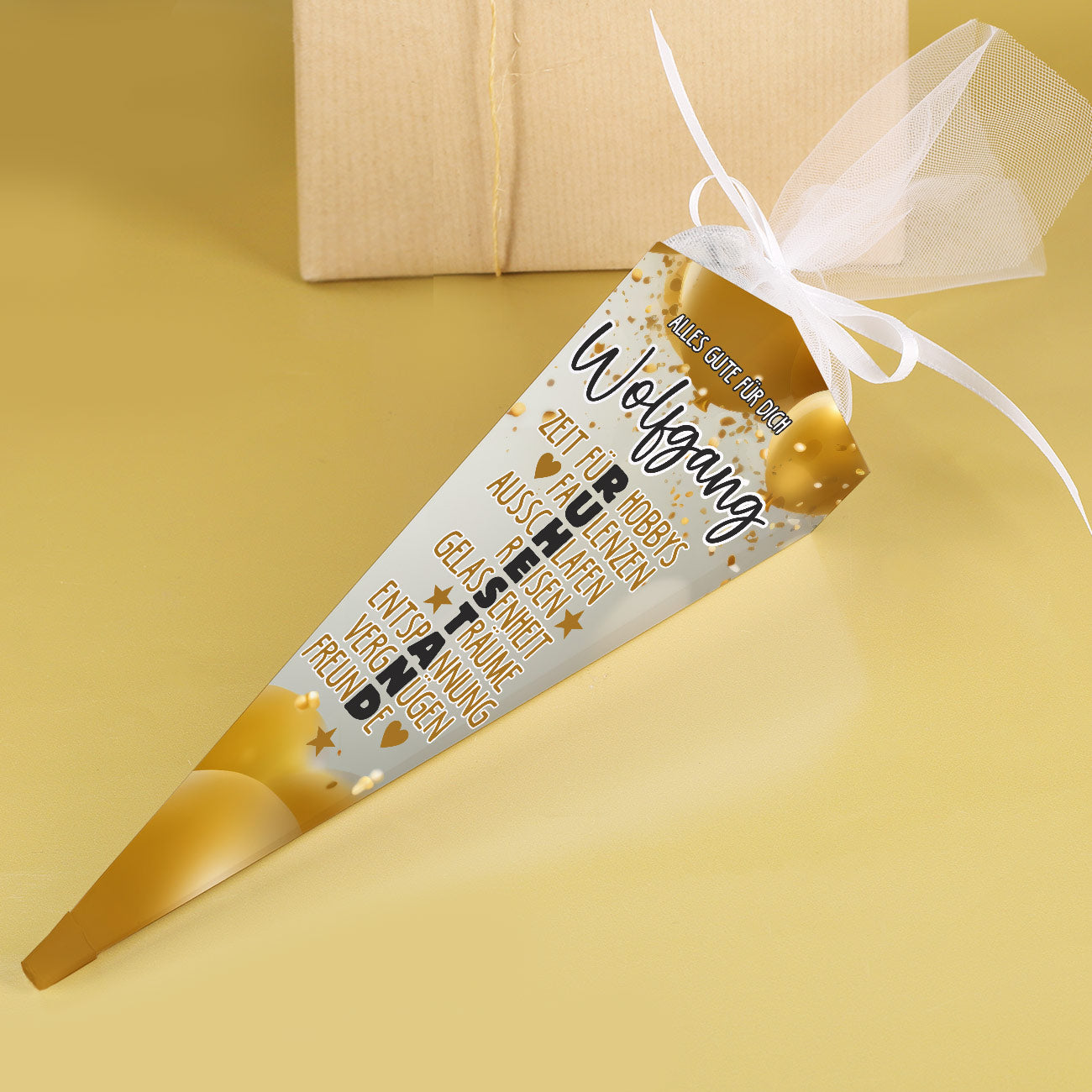 - Personalisierbar: Der Name des Ruheständlers wird individuell auf die Schultüte gedruckt.