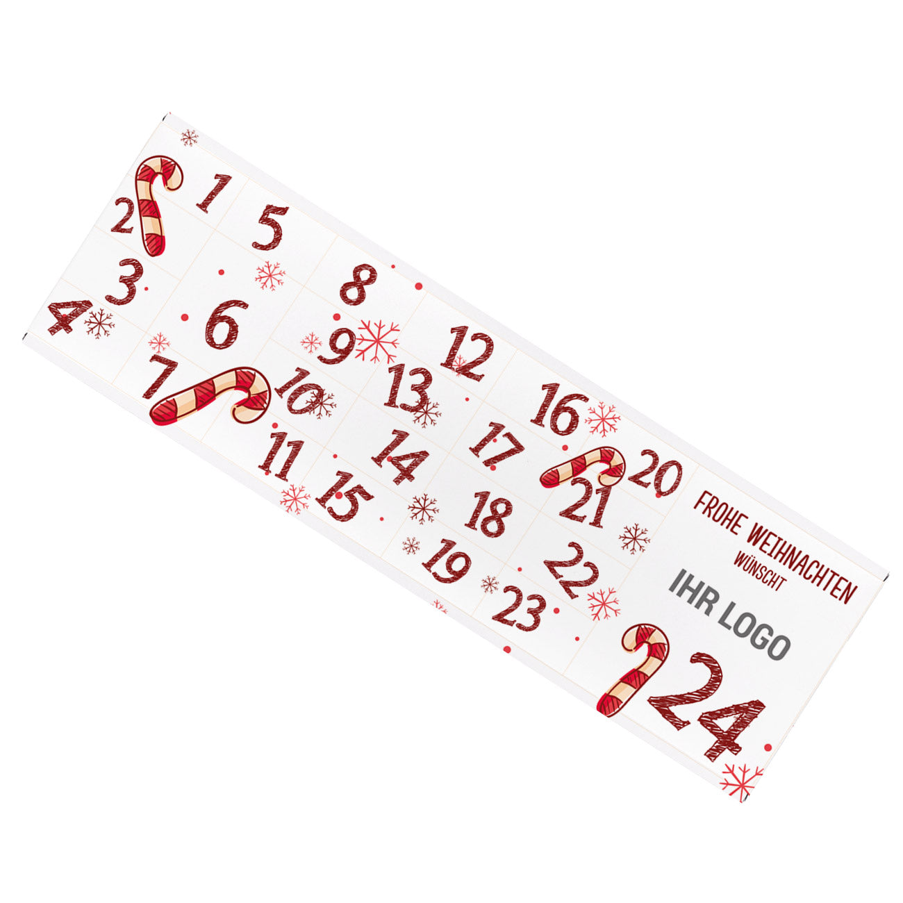 Mit seinem kompakten Design und der ansprechenden Gestaltung mit klassischen Weihnachtsmotiven wie Zuckerstangen und Schneeflocken steigert dieser Kalender die Vorfreude auf die Feiertage. Jeden Tag können Ihre Kunden oder Mitarbeiter ein Türchen öffnen und ein Stück köstliche Schokolade genießen – eine tägliche Erinnerung an Ihr Unternehmen.