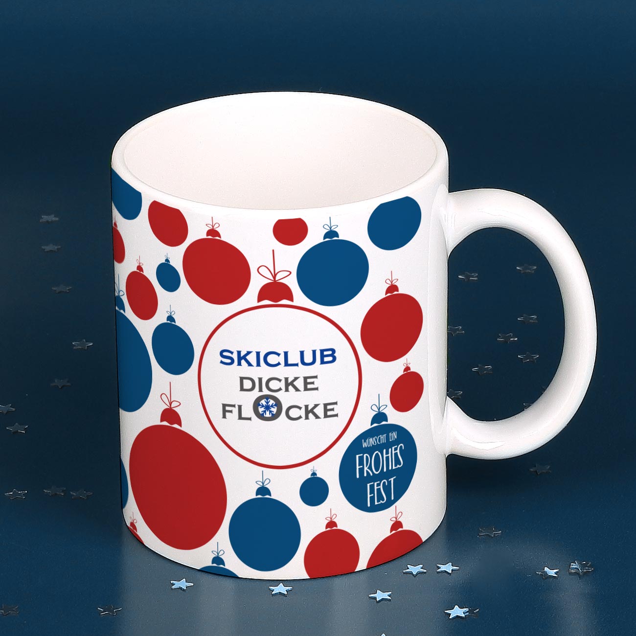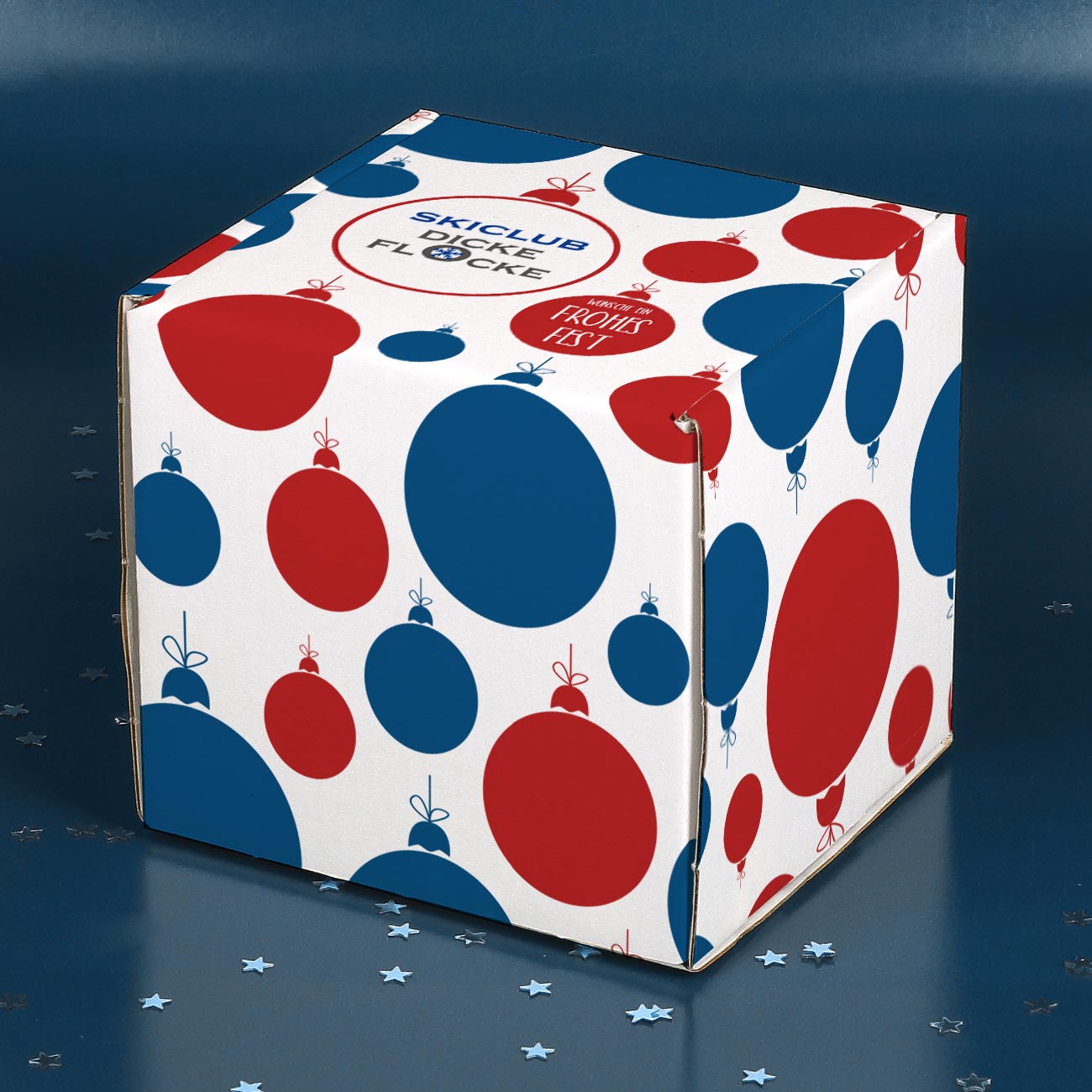 Auf der weißen Keramiktasse drucken wir ein weihnachtliches Motiv aus rot und blauen Weihnachtskugeln. In einem der Kugel befindet sich der Weihnachtsgruß und in einer anderen Ihr Firmenlogo. Somit kann der Beschenkte sich immer an Ihre Firma erinnern. In der Tasse befindet sich ein cremfarbenes Organzasäckchen, dass mit 8 Lindt Lindor-Kugeln befüllt ist. Für das perfekte Geschenkset darf naütrlich die Geschenkverpackung nicht fehlen. Die Verpackung aus Karton wird in dem gleichen weihnachten Motiv bedruckt.
