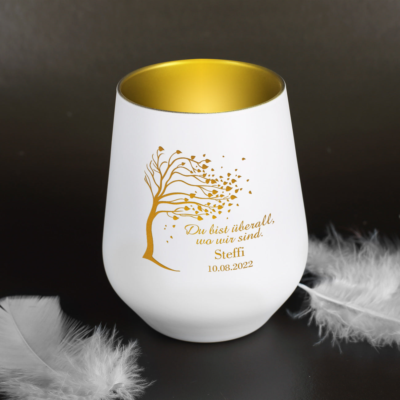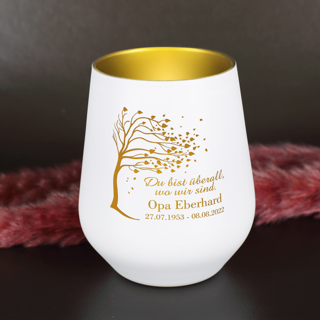 Mit diesem weißen Kerzenbecher haben Sie ein schönes Erinnerungsstück an einen lieben Verstorbenen. Graviert wird das Windlicht mit einem wehenden Baum, dessen lose Blätter durch die Luft getragen werden. Zudem wird der Spruch „Du bist überall, wo wir sind“ daneben platziert. Unter dem Spruch werden die persönlichen Daten, wie der Name und die Lebensdaten des Verstorbenen graviert.