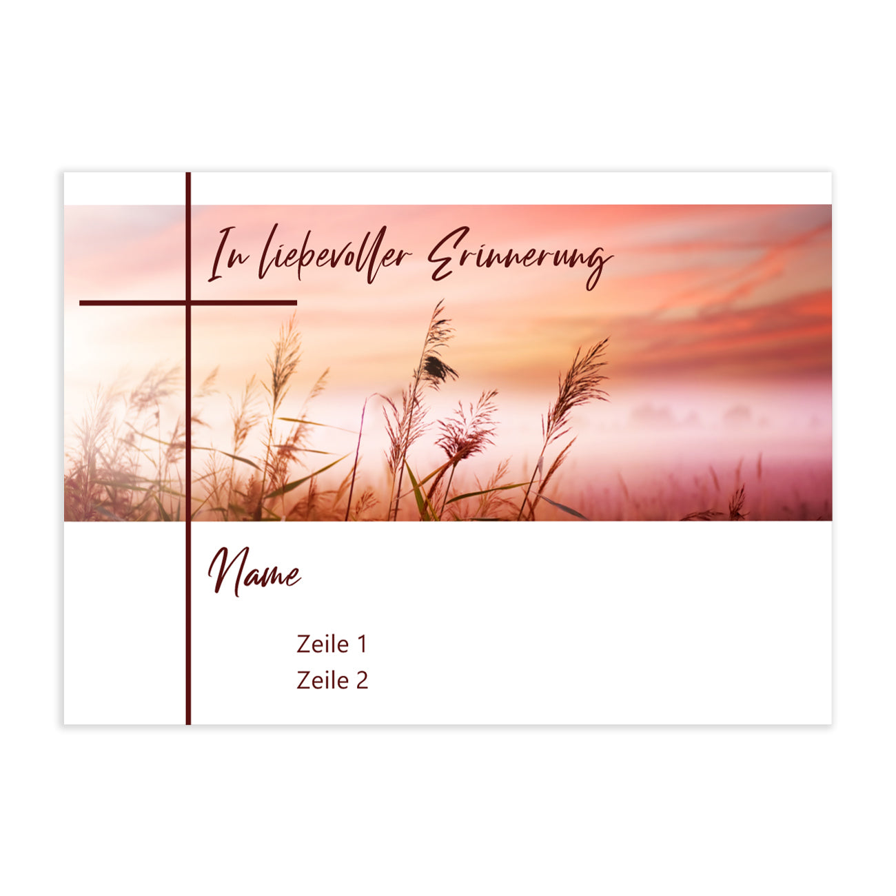 Das Design zeigt ein friedliches Landschaftsbild bei Sonnenuntergang, das von warmen Farben dominiert wird. Ein Kreuz und der Schriftzug "In liebevoller Erinnerung" ergänzen das harmonische Design, während der Name des Verstorbenen, sowie der Wunschtext in zwei Zeilen auf der Vorderseite gedruckt sind.