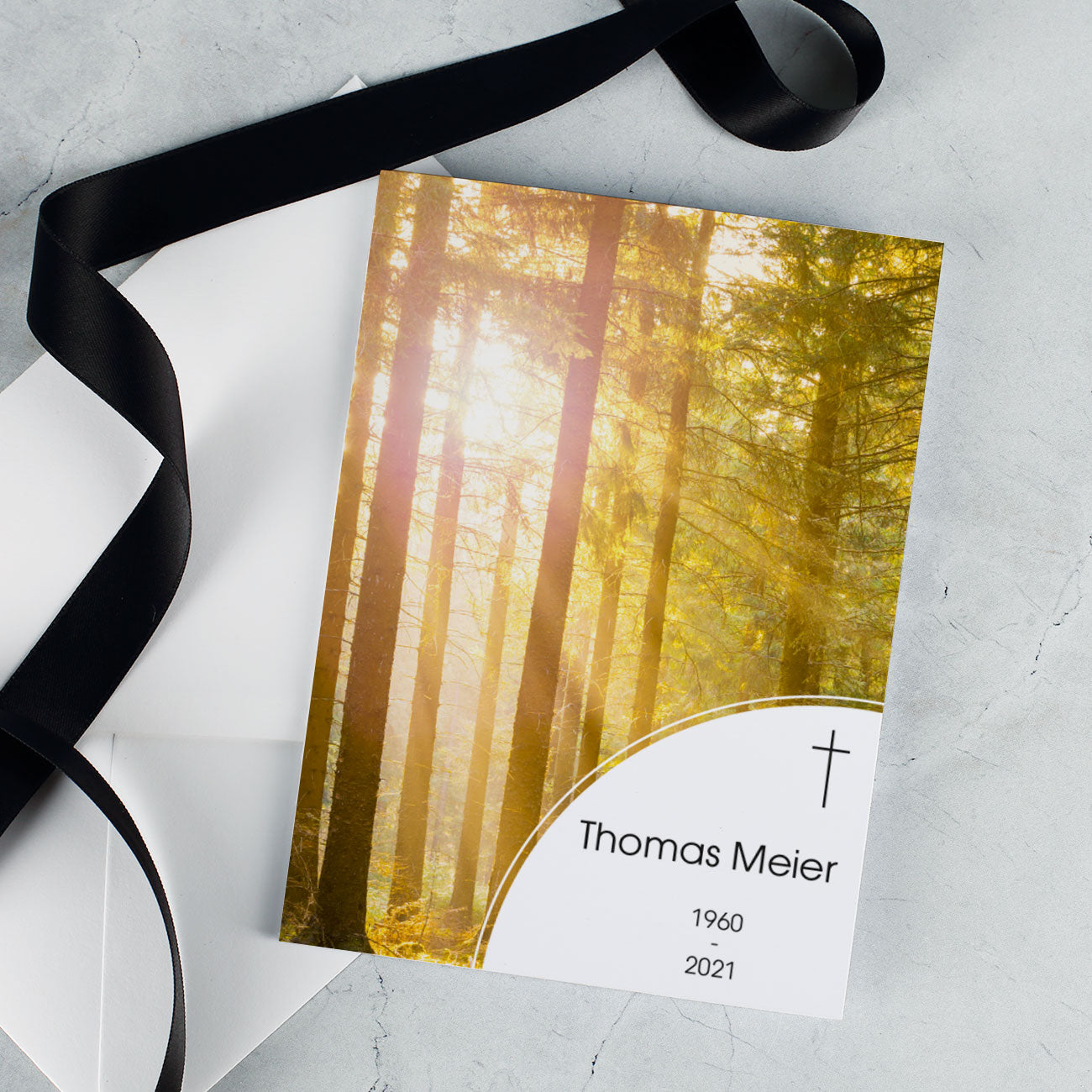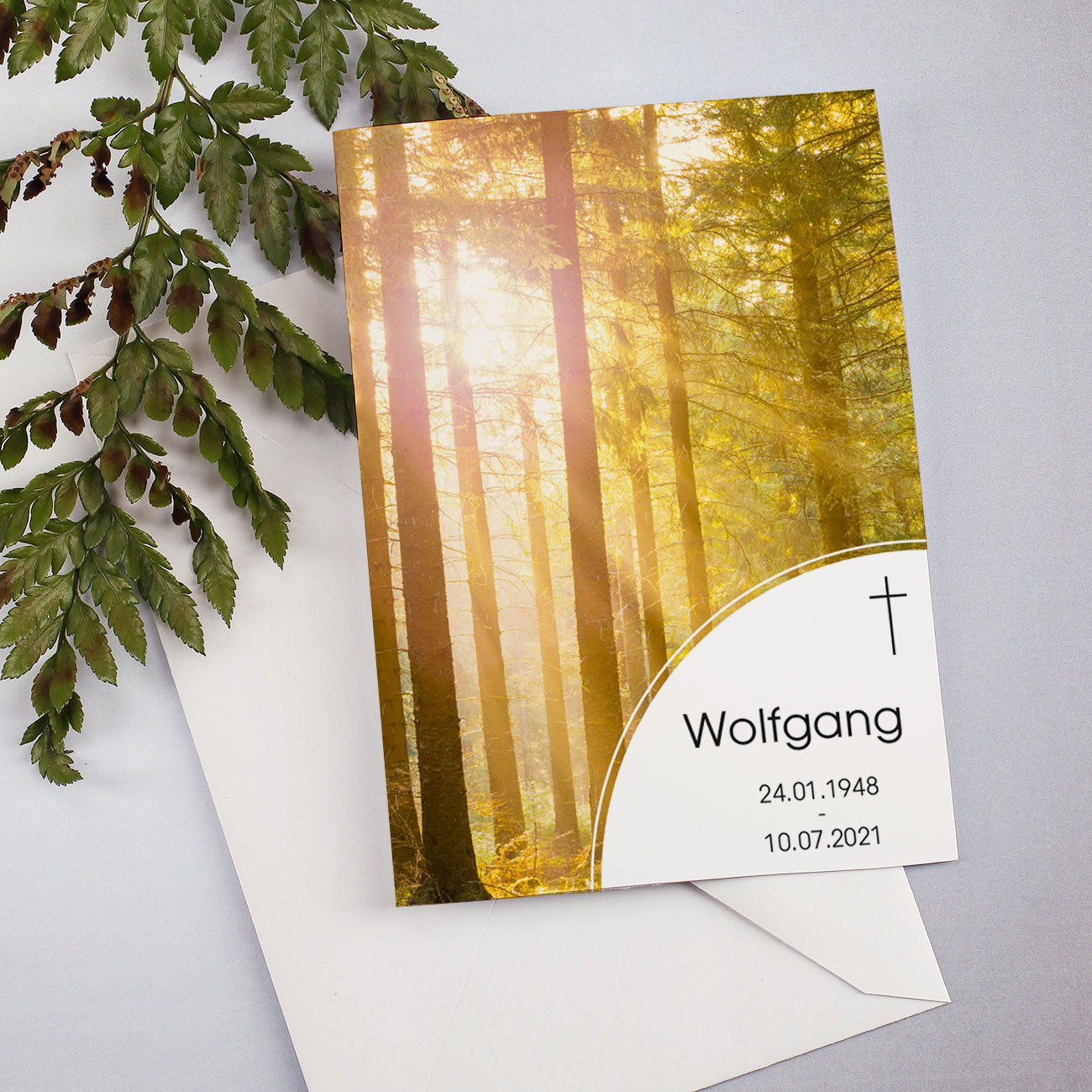 Das Design der Karte zeigt ein beruhigendes Waldmotiv mit Lichtstrahlen, die durch die Bäume fallen, was eine friedliche und tröstliche Atmosphäre vermittelt. Auf der Vorderseite der Karte ist ein Kreuz abgebildet, was sie zu einer passenden Wahl für christliche Trauerfeiern macht. Der Name des Verstorbenen sowie die Geburts- und Sterbedaten werden in klarer, gut lesbarer Schrift gedruckt.