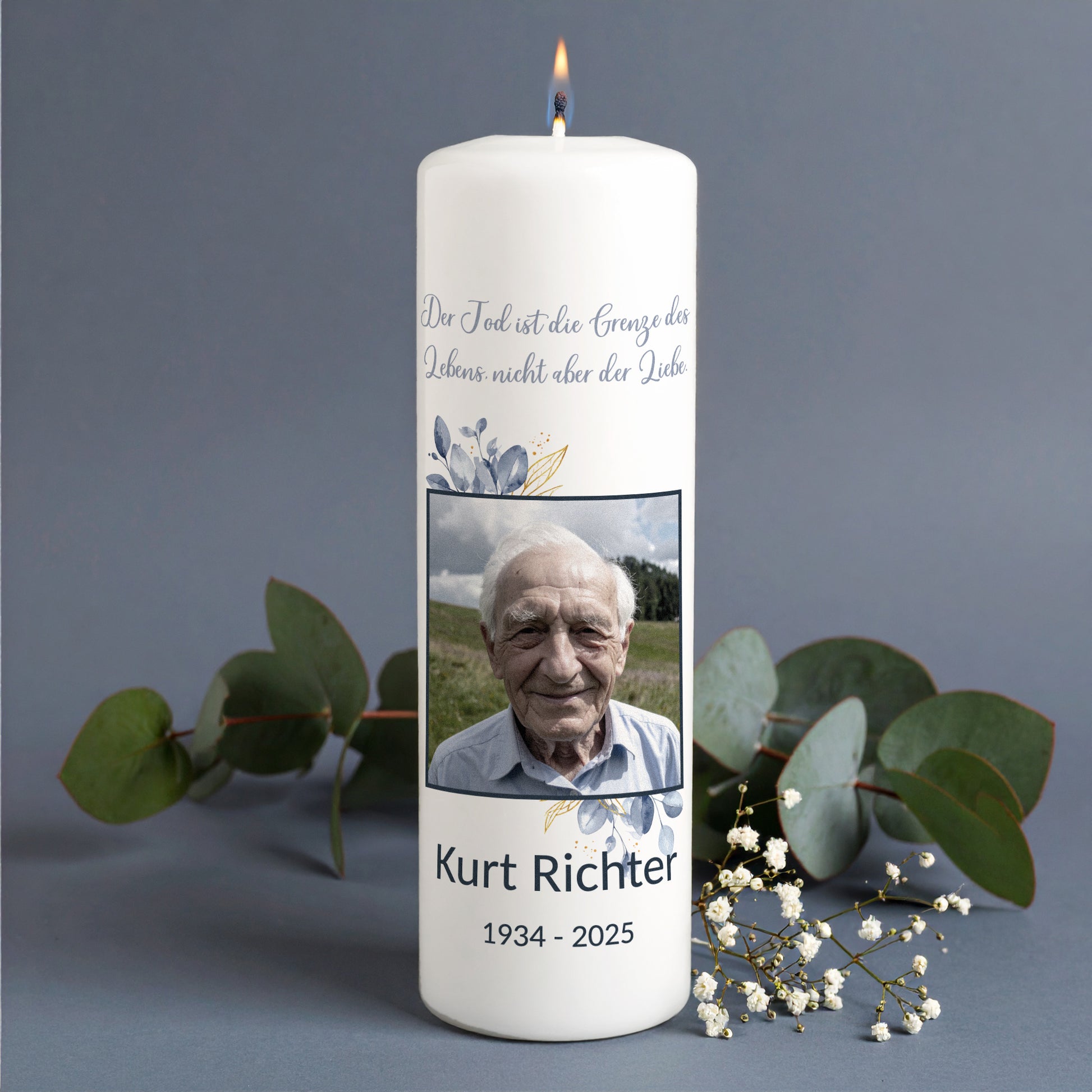 Trauerkerze mit Foto, Name und Datum - Gedenkkerze mit Blumenmotiv