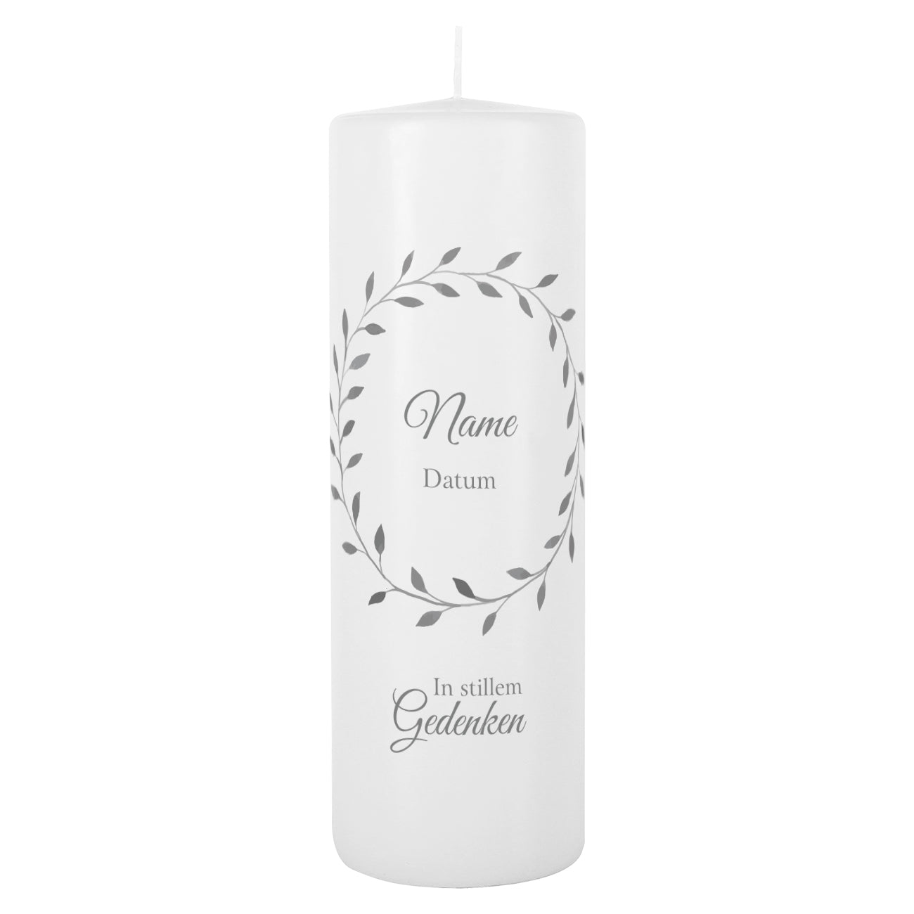 Diese Trauerkerze wird mit einem schlichten Blätterkranz bedruckt. In dem Blätterkranz steht der Name des/der Verstorbenen sowie die Lebensdaten. Darunter wird der Schirftzug "In stillem Gedenken" platziert.