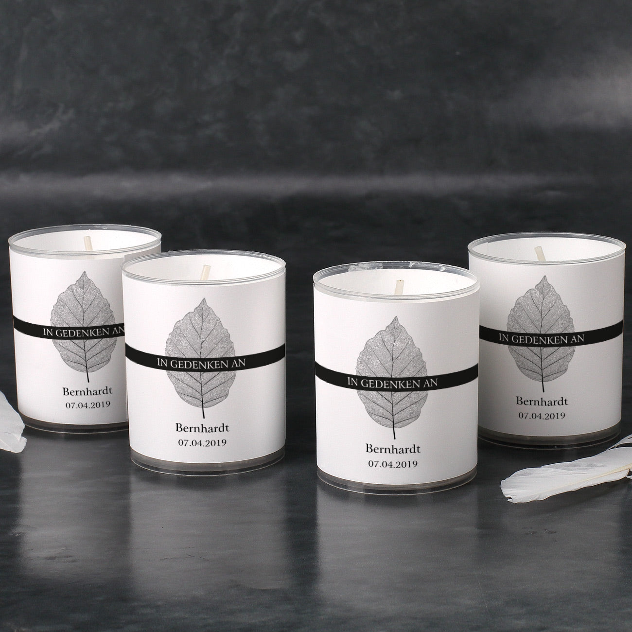 Diese kleinen Teelichter werden mit einer Banderole beklebt. Darauf ist ein Blatt mit dem Schriftzug "In Gedenken an" sowie der Name und das Datum der/des Verstorbenen zu sehen. Die Kerzen können bei der Trauerfeier oder bei der Beerdigung als Dekoration verwendet werden.