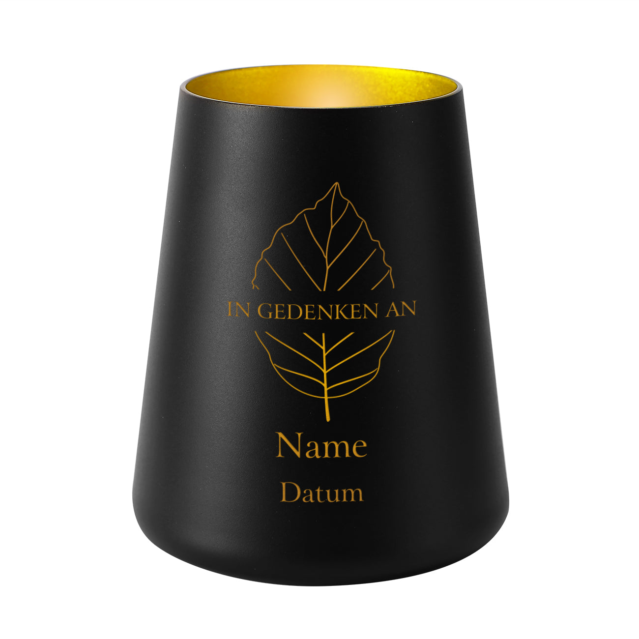 Mit diesem Trauerwindlicht können Sie den Verlust über einen verlorenen Menschen sehr gut zum Ausdruck bringen. Durch das schlichte Design wird die Aufmerksamkeit auf die Gravur der Vorderseite gerichtet. Diese zeigt als Motiv ein Blatt in Gold. In der Mitte befindet sich der Spruch "In Gedenken an" und wird durch die Personalisierung des Namens und das Datum des Todestages unterhalb des Motivs vollendet.