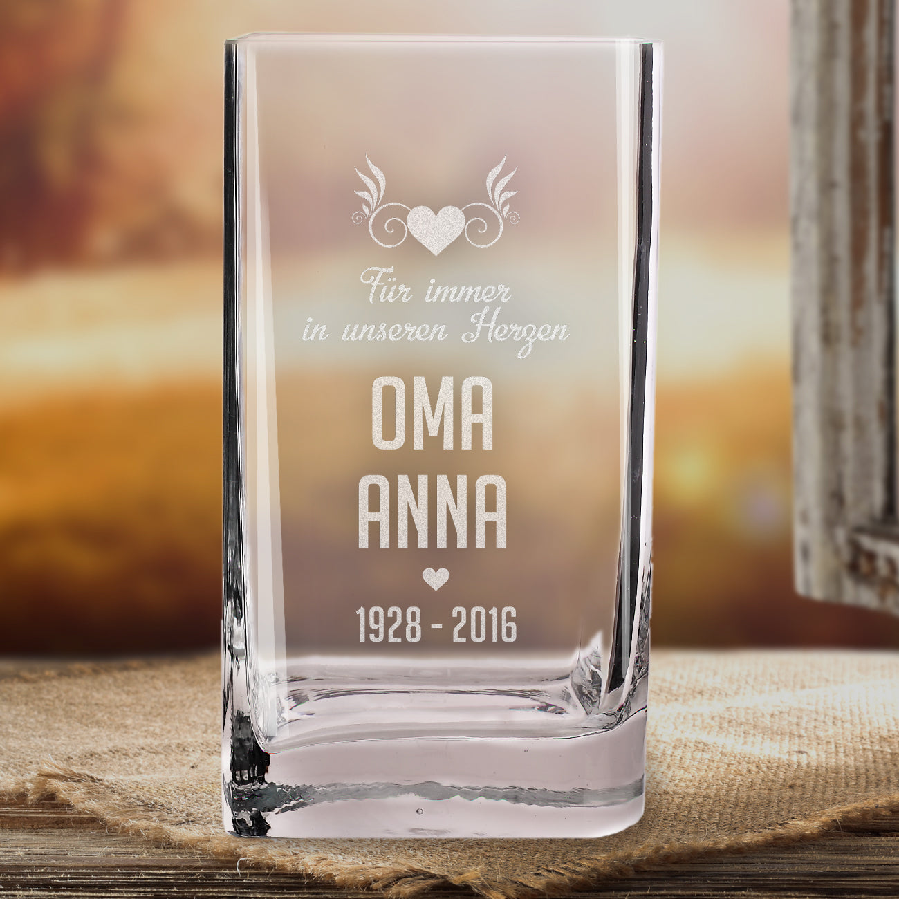 Diese Vase von der Marke Leonardo wird mit Namen des Verstorbenen sowie den Jahreszahlen graviert. Der Name wird groß in der Mitte platziert. Über dem Namen wird der Schriftzug "Für immer in unseren Herzen" graviert. Verziert wird das Ganze mit Herzen.
