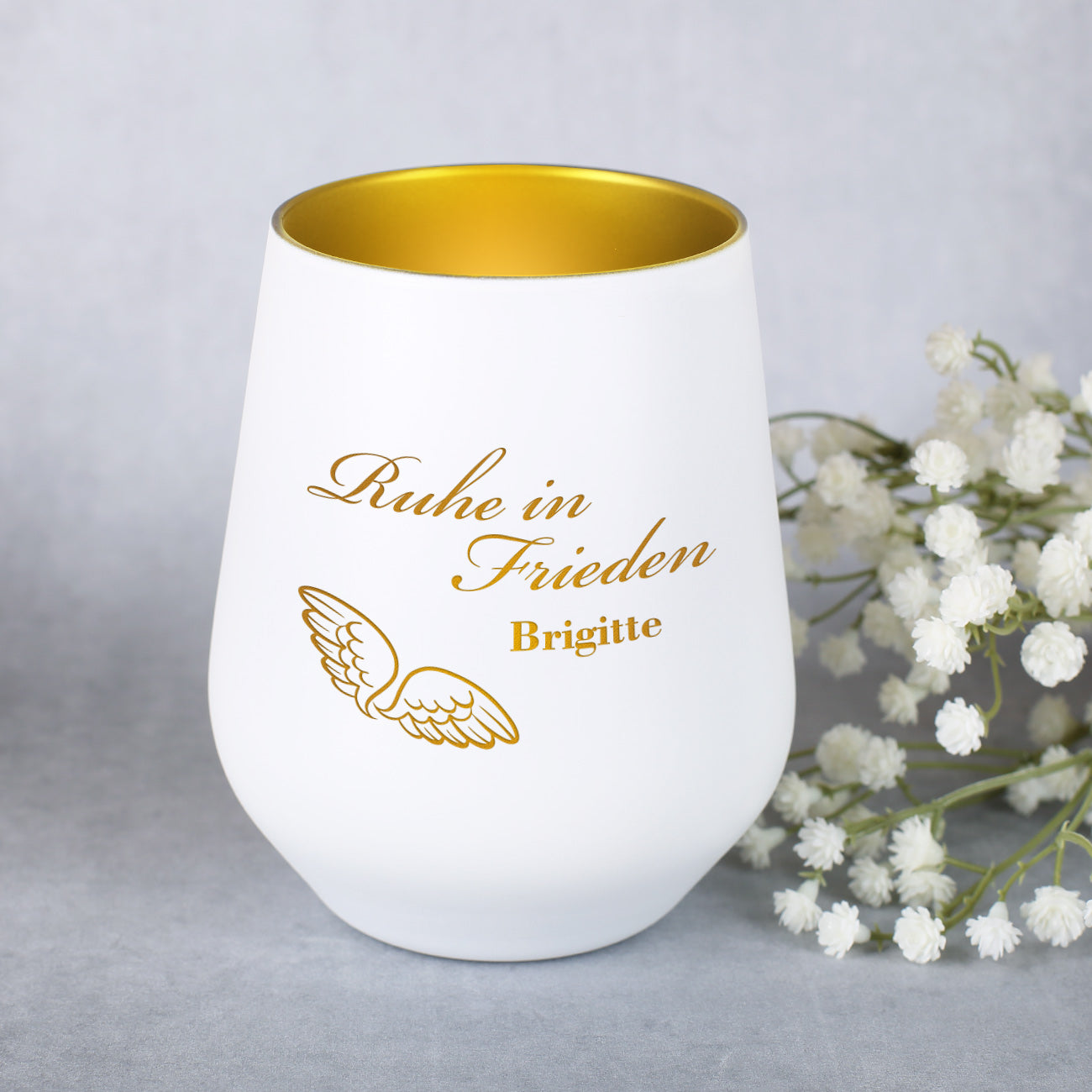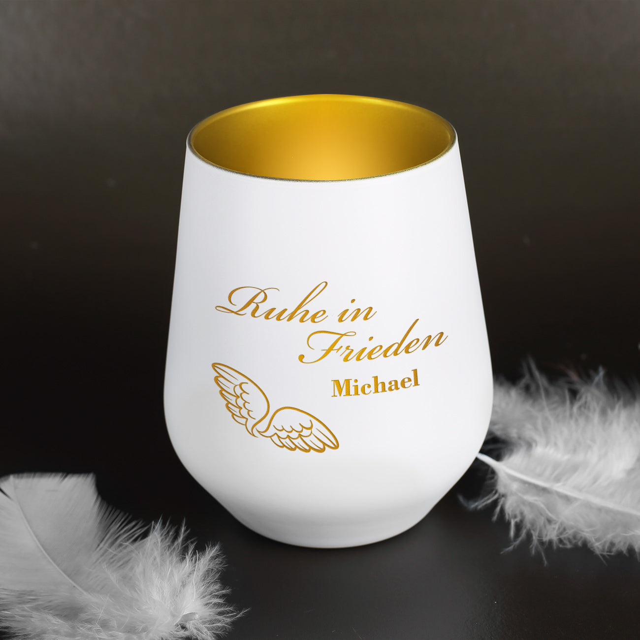 Dieses weiße Windlicht wird mit dem Namen des/der Verstorbenen graviert. Zusätzlich wird der Kerzenbecher mit dem Schriftzug "Ruhe in Frieden" sowie Engelsflügeln verziert. Die Gravur kommt durch die goldene Innenfarbe bei Kerzenschein noch besser zum Vorscheinen.