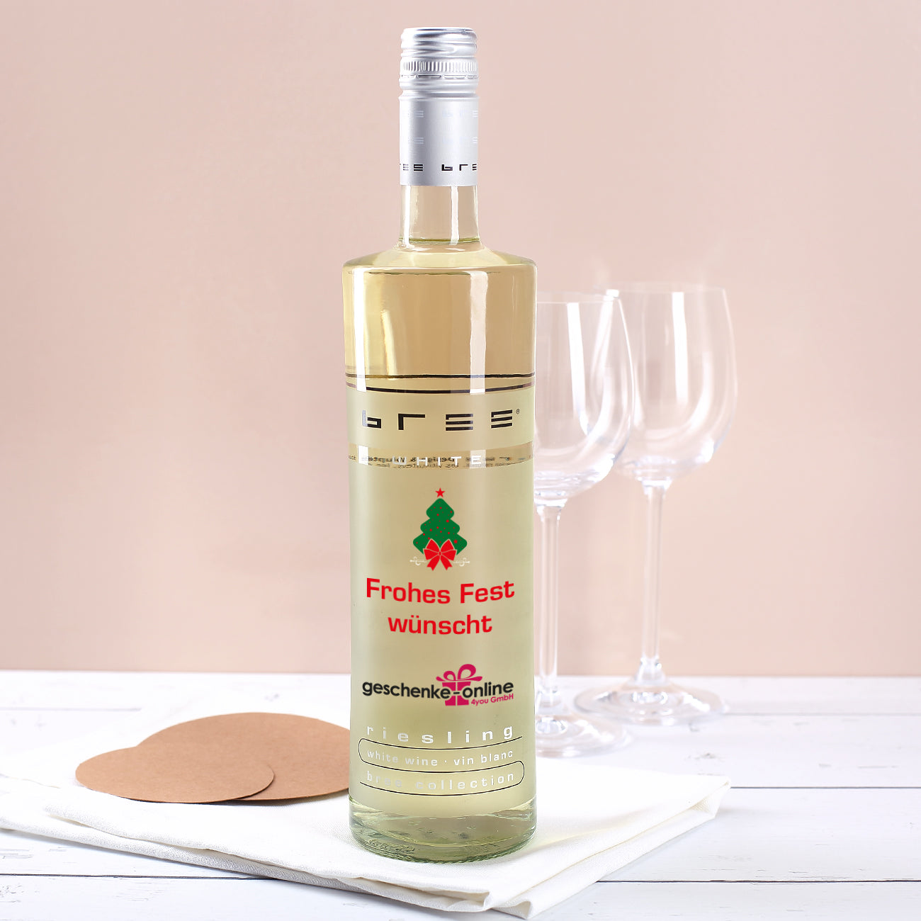 Weißweinflasche bedruckt mit Firmenlogo