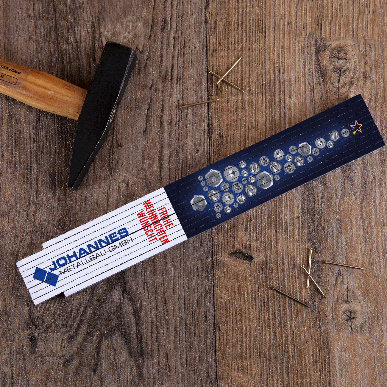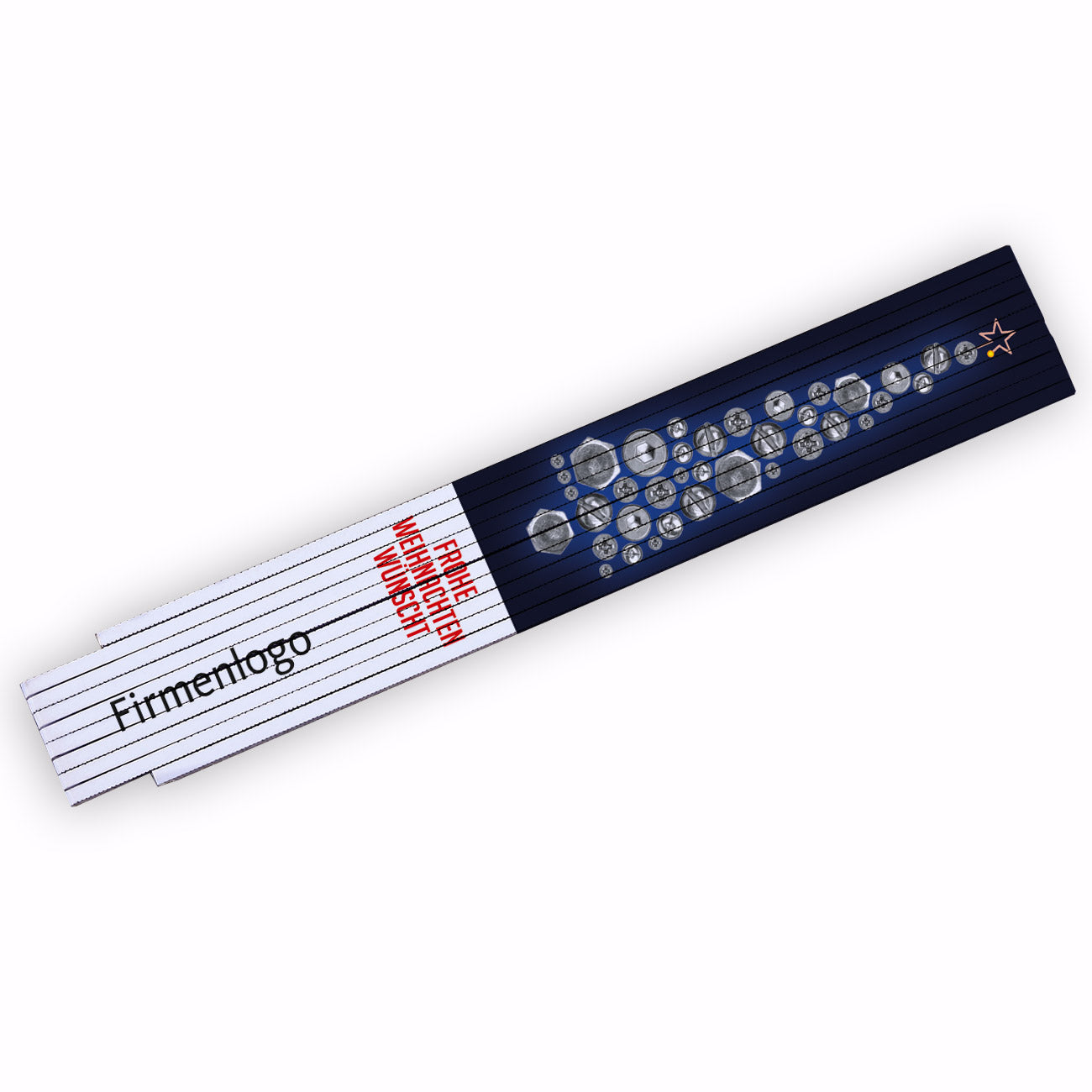 Zollstock mit Firmenlogo und Weihnachtsbaum aus Schrauben